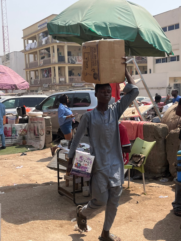 An outdoor market scene is depicted under a clear, bright sky in Abuja, Nigeria. The primary subject is a young male, likely in his late teens or early twenties, with dark skin, wearing a grey traditi…read more