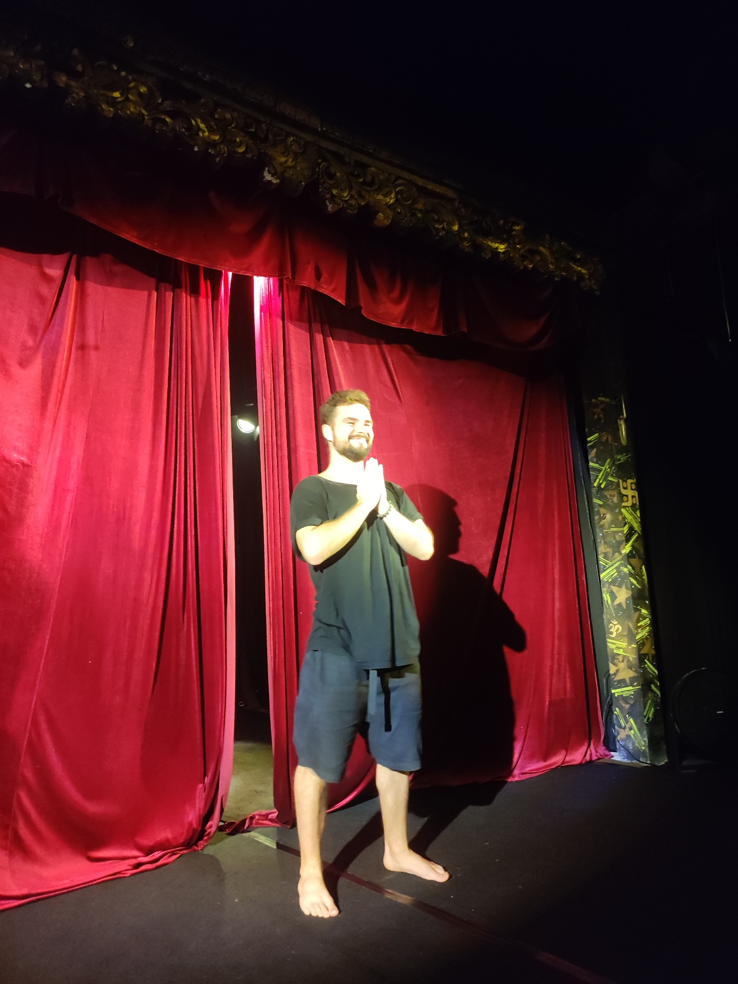 A medium shot captures a barefoot man with a beard, wearing a black t-shirt and blue shorts, standing on a stage. His hands are together in a prayer-like gesture. Behind him are red stage curtains, an…read more
