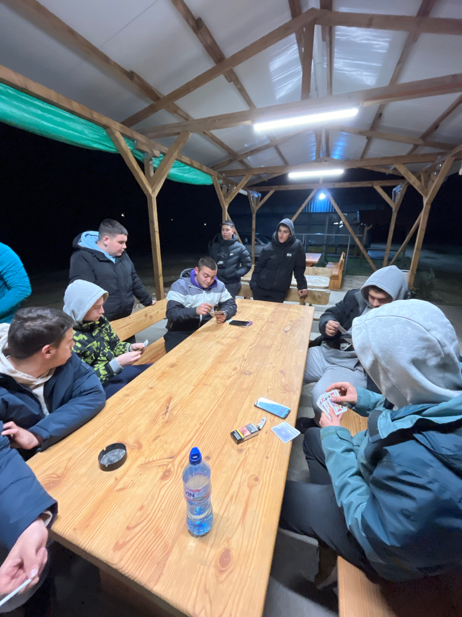 In Karavelovo, Bulgaria, a group of approximately eight young men are gathered around a long, wooden table under a wooden-framed structure illuminated by two fluorescent tube lights. The structure has…read more