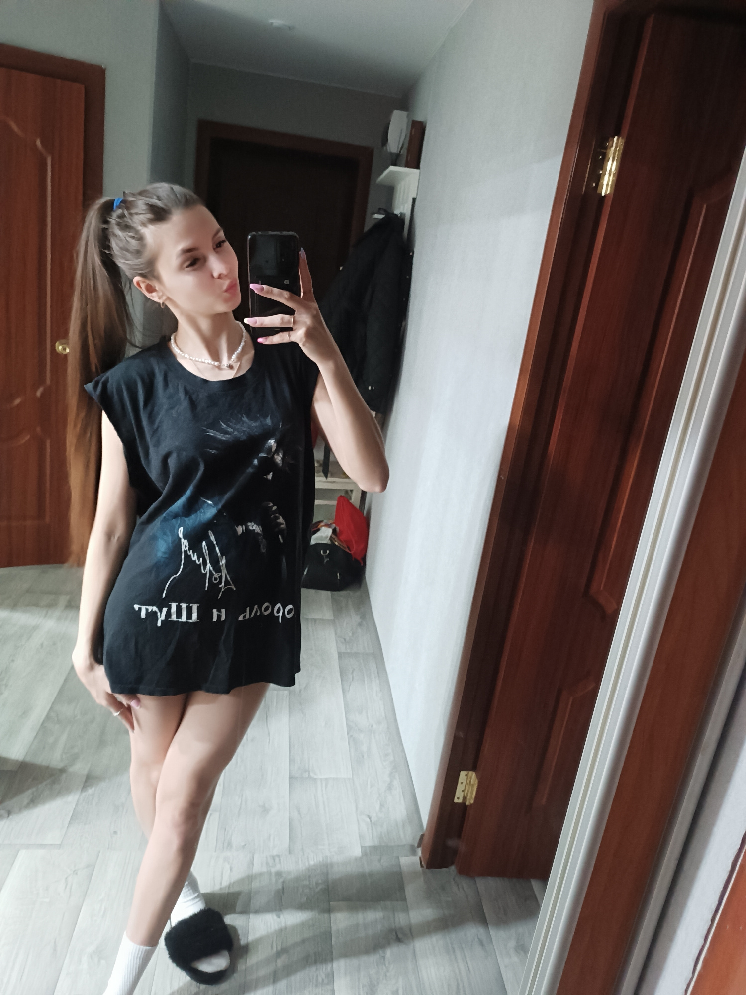 A young woman is posing for a selfie in an indoor environment. She has long brown hair pulled back in a ponytail with a blue scrunchie. She wears a black oversized graphic t-shirt, a pearl necklace, w…read more