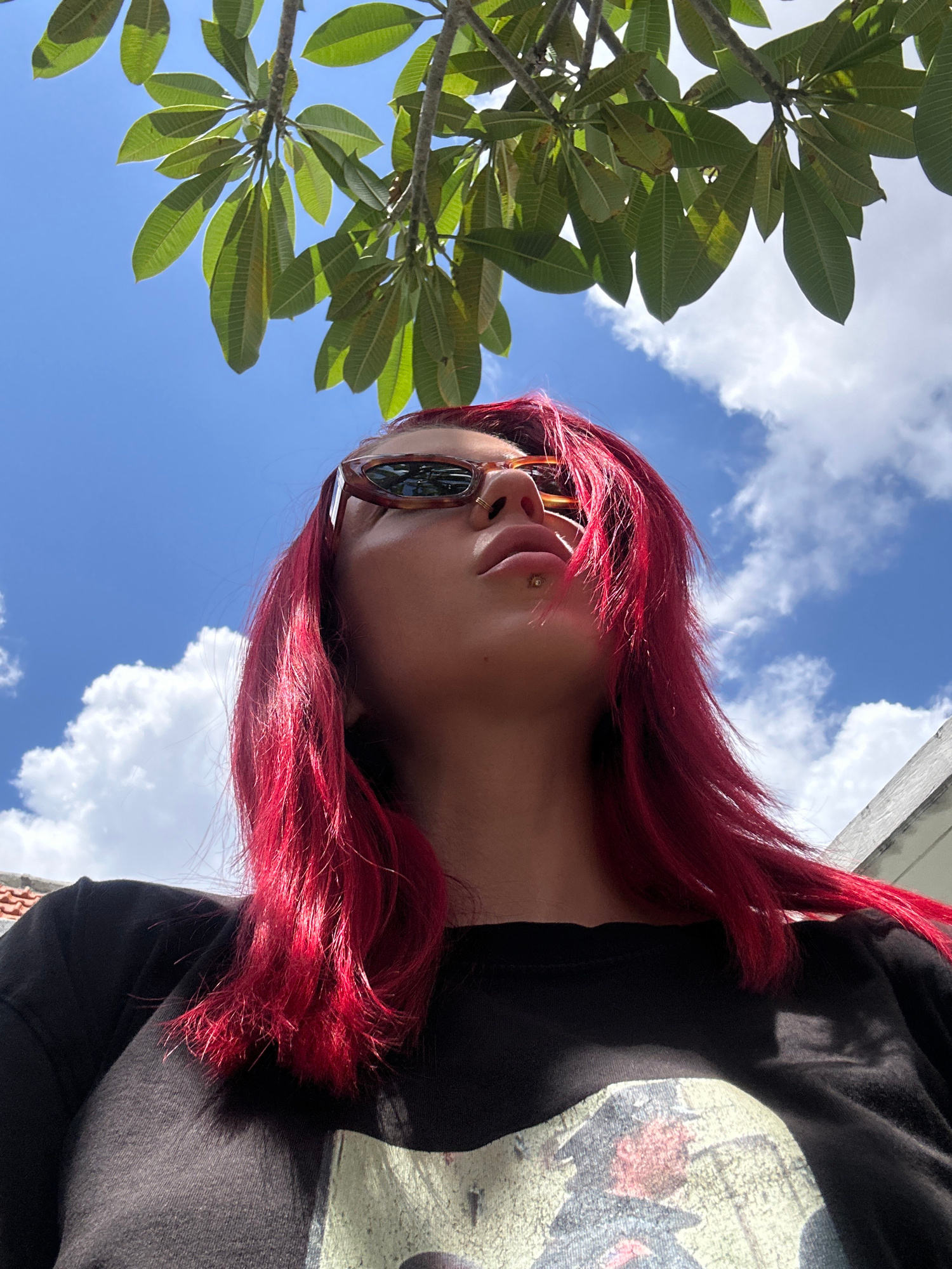 A photograph taken in North Kuta, Indonesia, depicts a woman with dyed red hair wearing sunglasses and a black t-shirt with a graphic print. She is positioned beneath a tree with large green leaves ag…read more