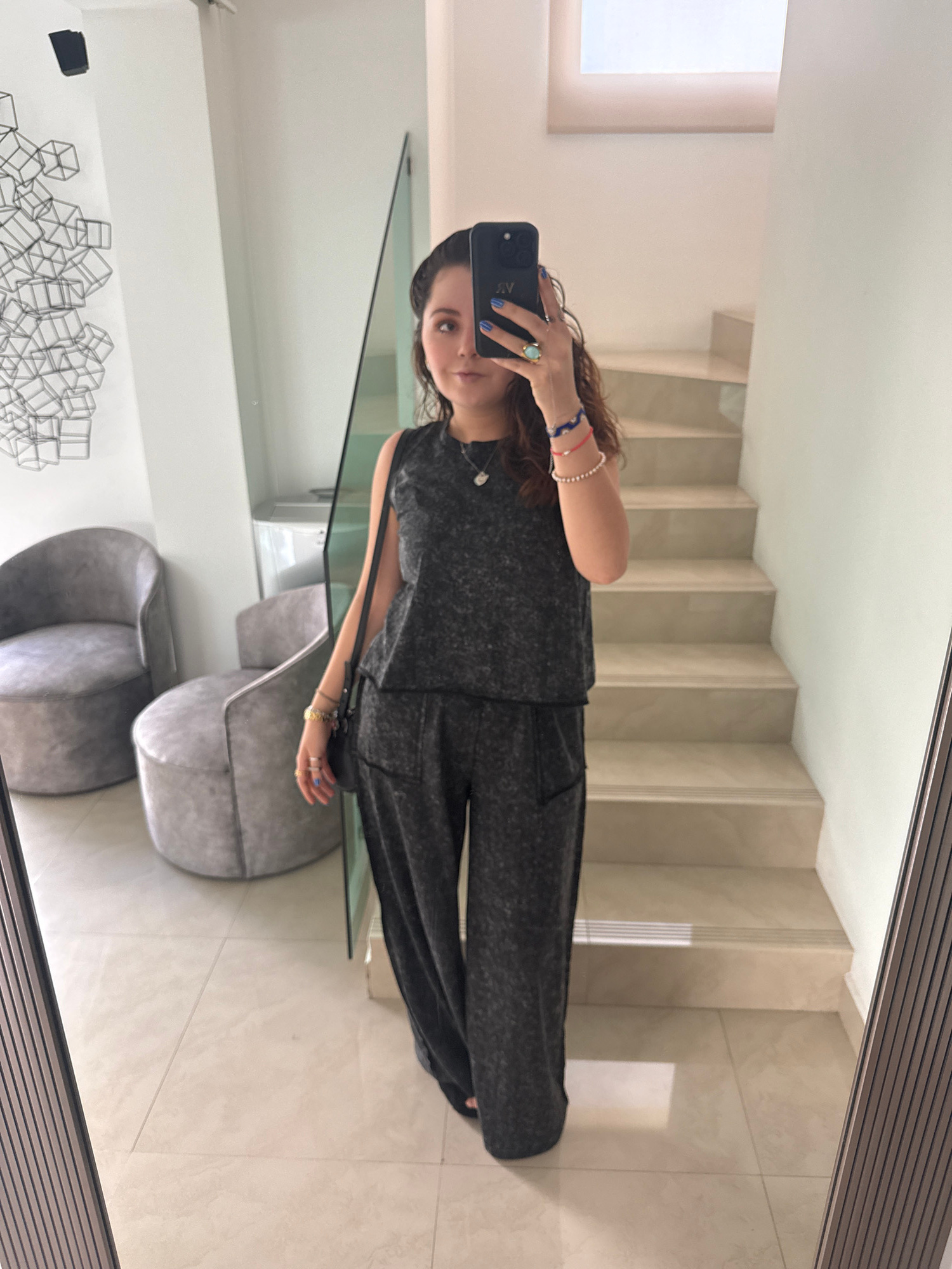 A woman is standing in front of a mirror, taking a selfie with a black phone. The background shows a modern interior, including stairs and minimalist decor. The location is Santa Clara Ocoyucan, Mexic…read more