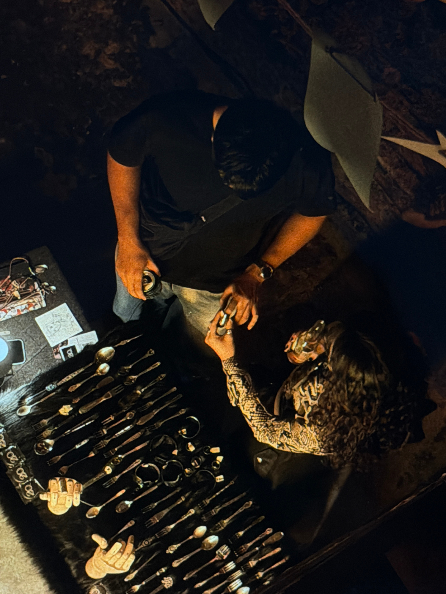 Two individuals are seated facing each other in what appears to be a dimly lit, indoor space. One person, presumably male, is wearing a dark t-shirt and light-colored jeans, holding a can in one hand…read more