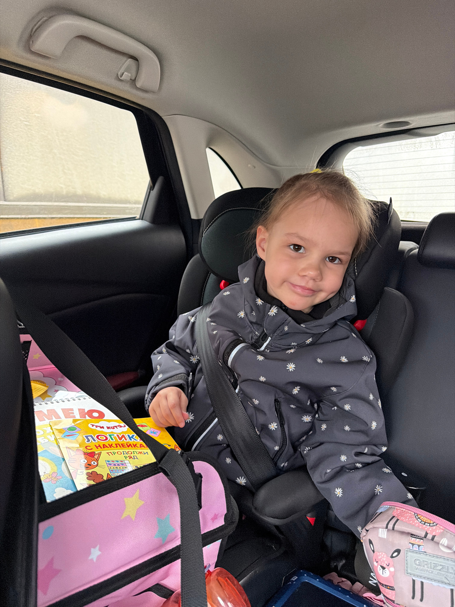 A young child is seated in a car seat within a vehicle. The child, wearing a grey jacket with a daisy pattern, is secured with a seatbelt. Next to the child, there is a pink bag with star decorations,…read more