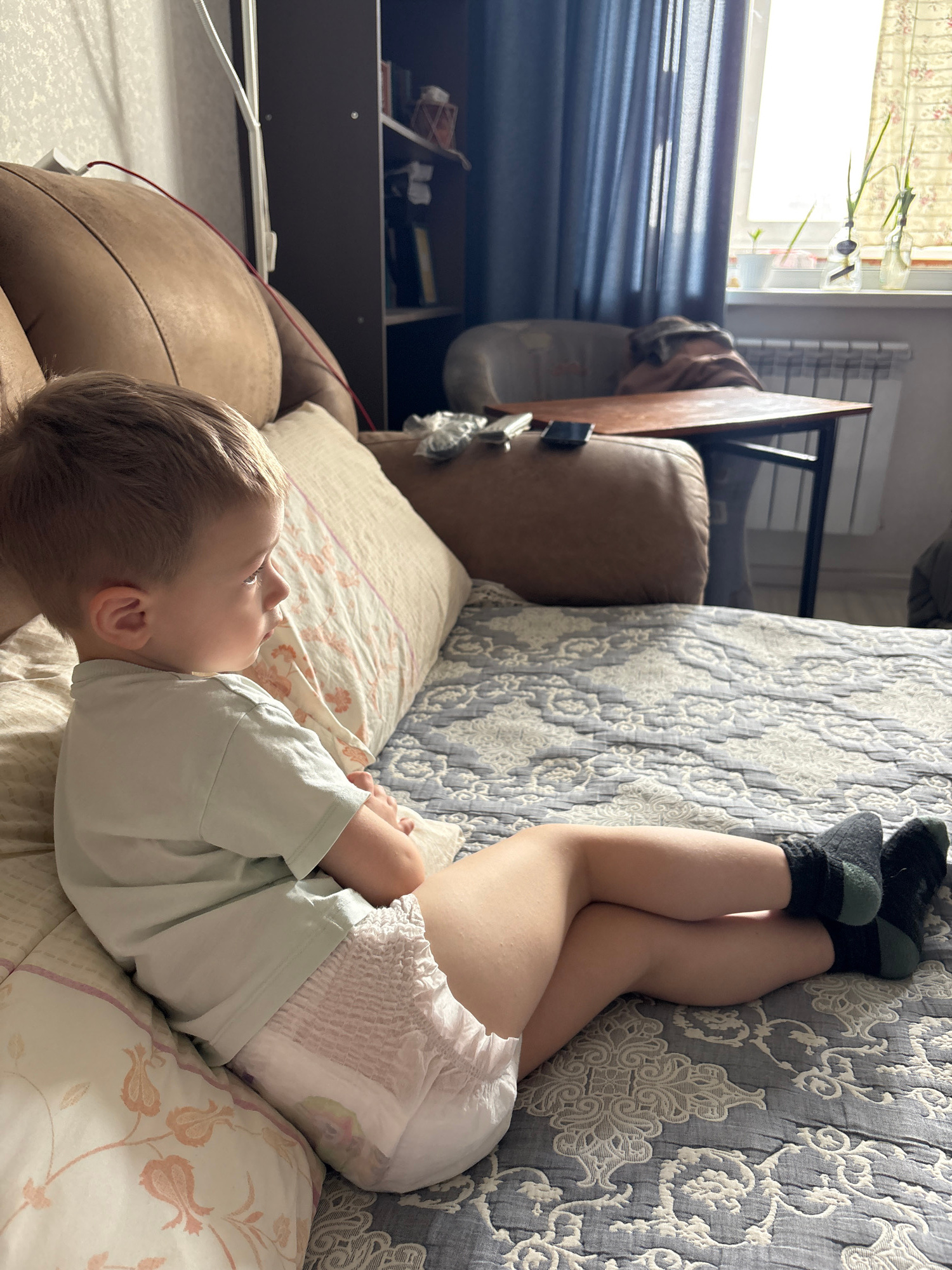 A young child lies on a bed in an indoor setting, likely a residential room. The child wears dark-colored socks and a diaper. The bed has a gray and white patterned bedspread and patterned pillows. A…read more