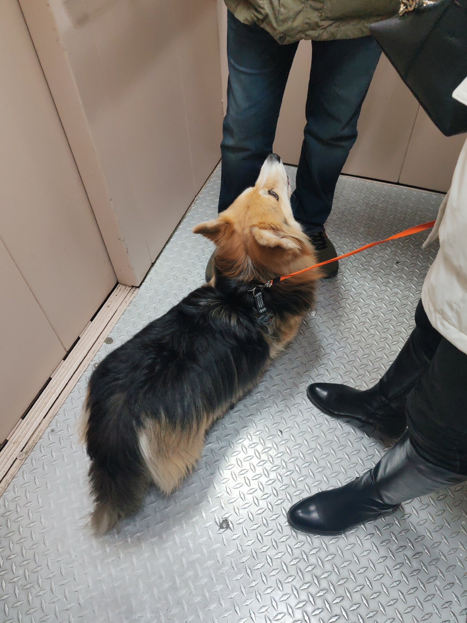 An overhead shot captures a tri-color Corgi dog and two partially visible individuals inside what appears to be an elevator, given the metal diamond plate floor and plain panel walls. The Corgi, pred…read more