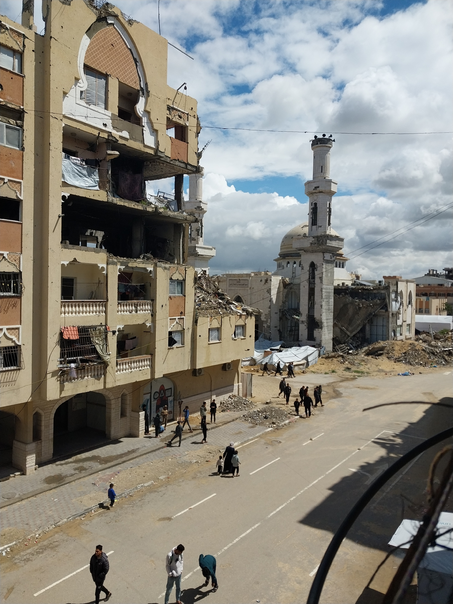 This image depicts a street scene in Khan Yunis, Palestinian Territory, showing significant destruction to urban structures under a partly cloudy sky. On the left, a multi-story building with a light…read more
