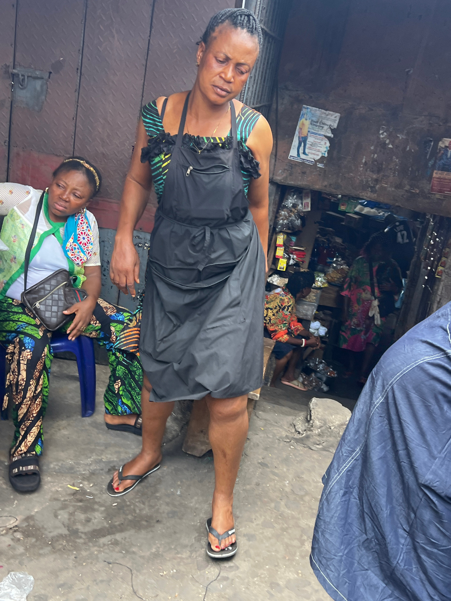 The image depicts a street scene in Nkpor, Nigeria. A woman in a black dress stands with another woman seated on a blue plastic chair. The seated woman is wearing a patterned dress with white top. A h…read more