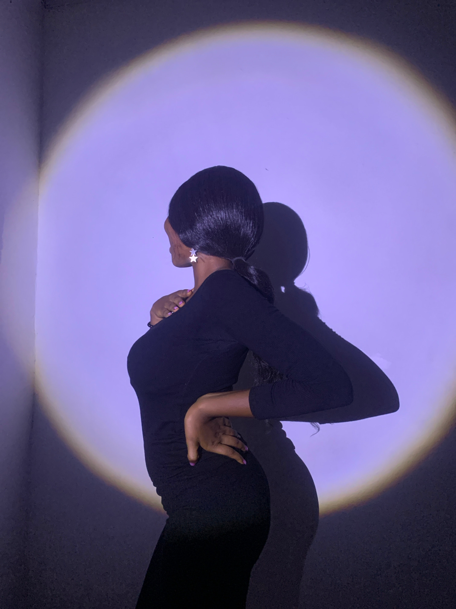 A dark-skinned woman wearing a black, long-sleeved dress stands in a room with a spotlight shining on her. She has short, dark hair, and is wearing star-shaped earrings. Her left hand is on her hip an…read more