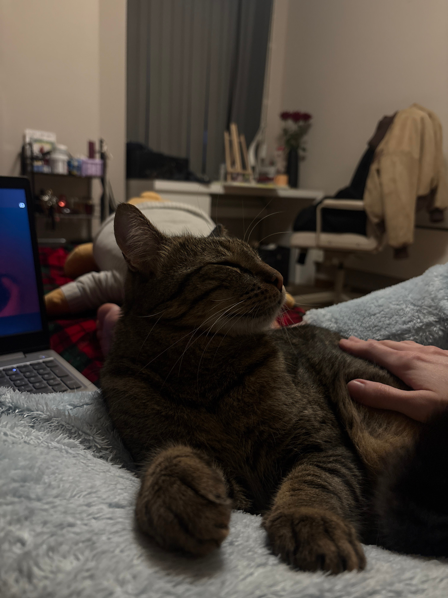 A brown tabby cat lies on a light blue, fuzzy blanket next to a laptop. A hand pets the cat. In the background, there is a shelf with various items and decorations, including what appears to be a florβ¦read more