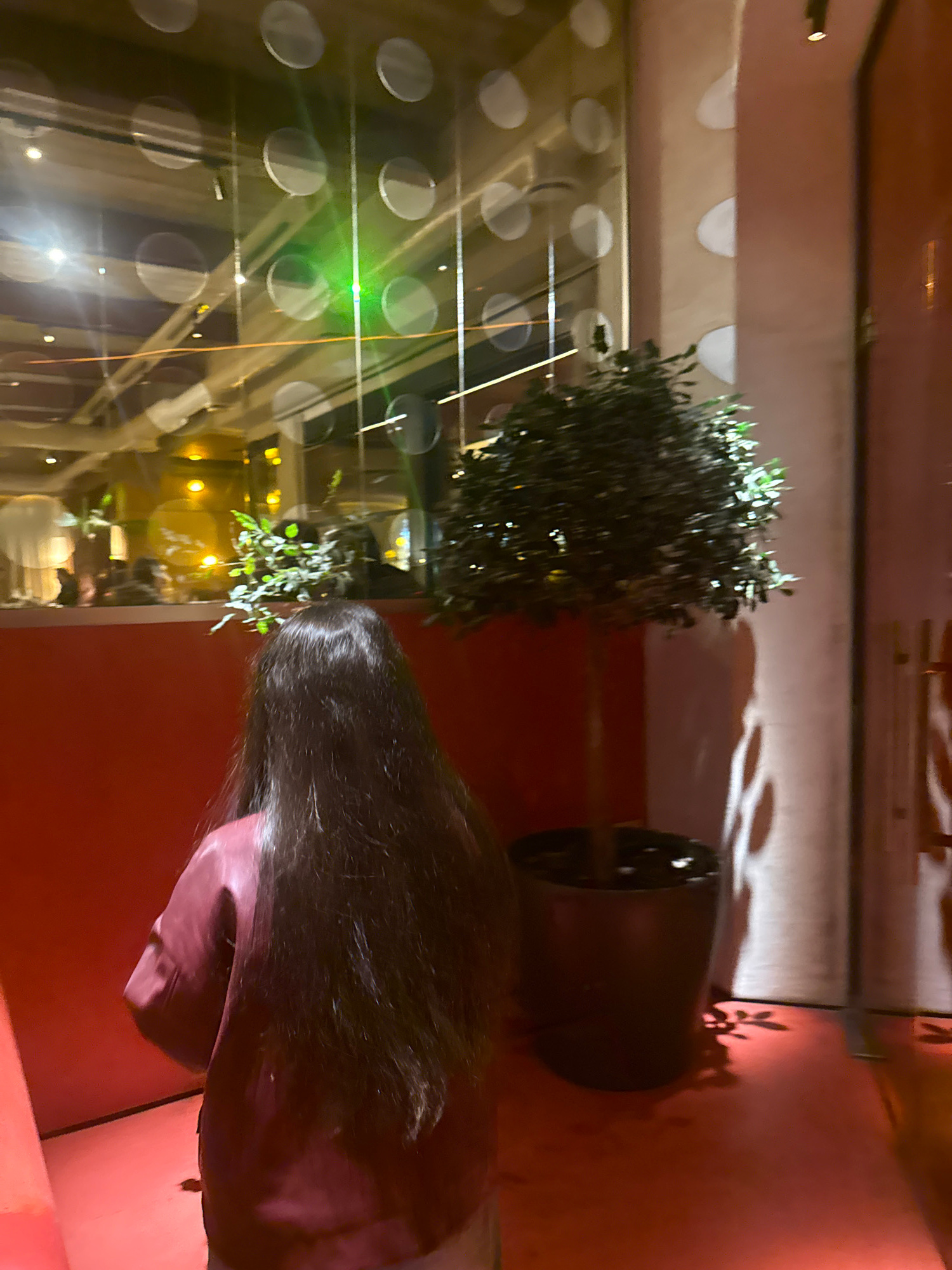 The image shows a dimly lit interior, seemingly in a modern building. Visible are architectural details including a wall with decorative circular indentations. A potted plant with dark green foliage i…read more