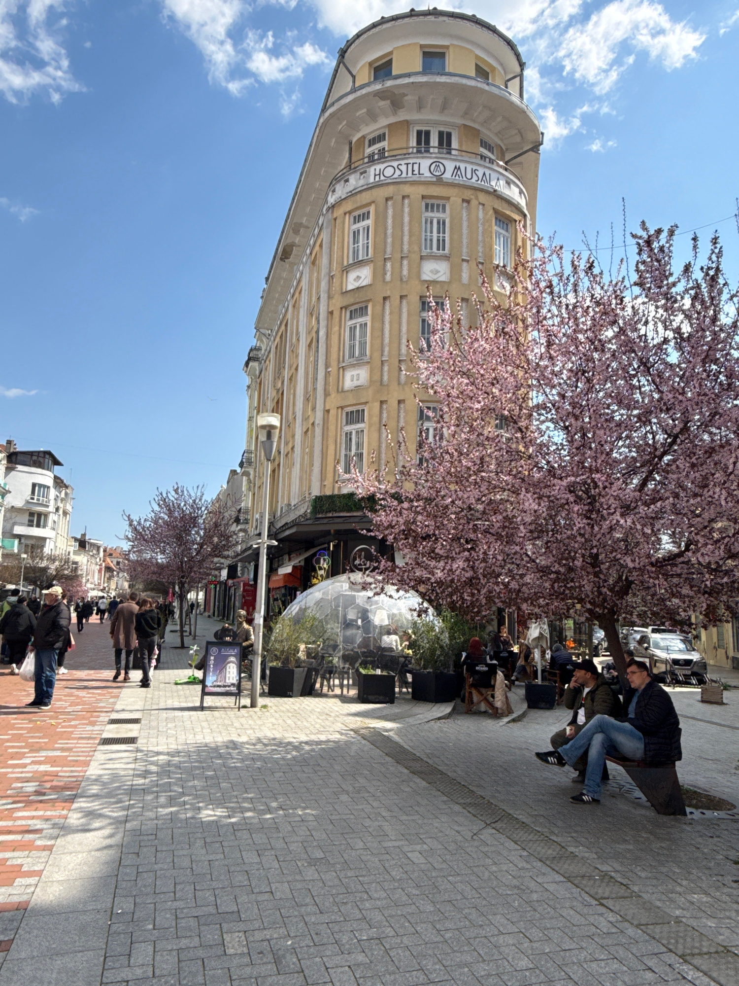 The image depicts a street scene in Varna, Bulgaria, characterized by a mix of architectural styles and vibrant urban life. **Environment:** The street is paved with rectangular gray stones, bordered…read more
