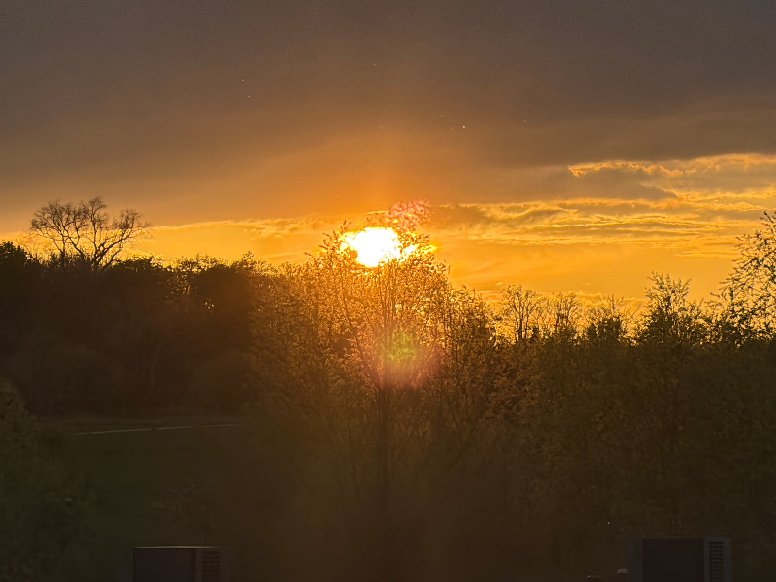 The image captures a serene landscape during either sunrise or sunset in Junglinster, Luxembourg. The sun, a brilliant white light source, is positioned centrally in the upper mid-ground, partially ob…read more