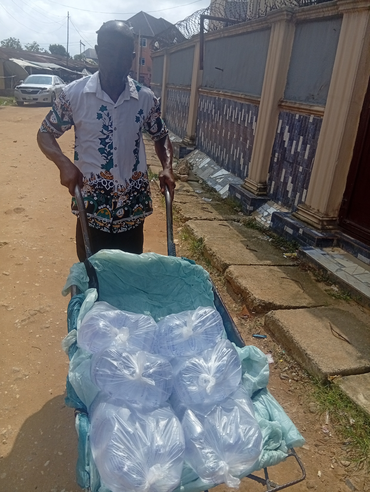 A man is depicted pushing a metal wheelbarrow filled with numerous sachets of water along an unpaved, dusty road in what appears to be an urban or semi-urban area in Aba, Nigeria. The man, an adult, w…read more