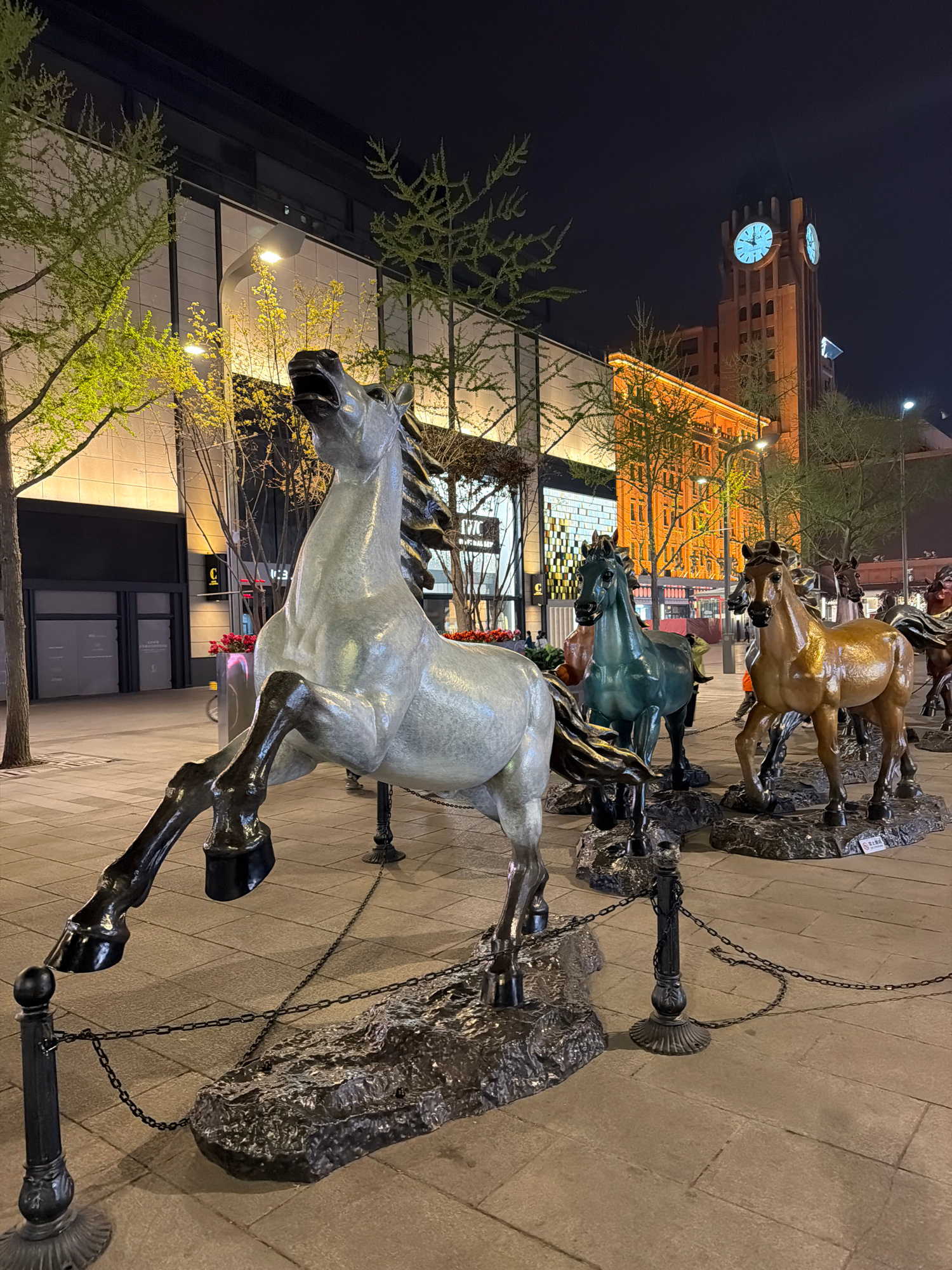 The image depicts a statue of galloping horses at night. The statue appears to be made of bronze or a similar material, with a white horse in the foreground and several other horses of different color…read more