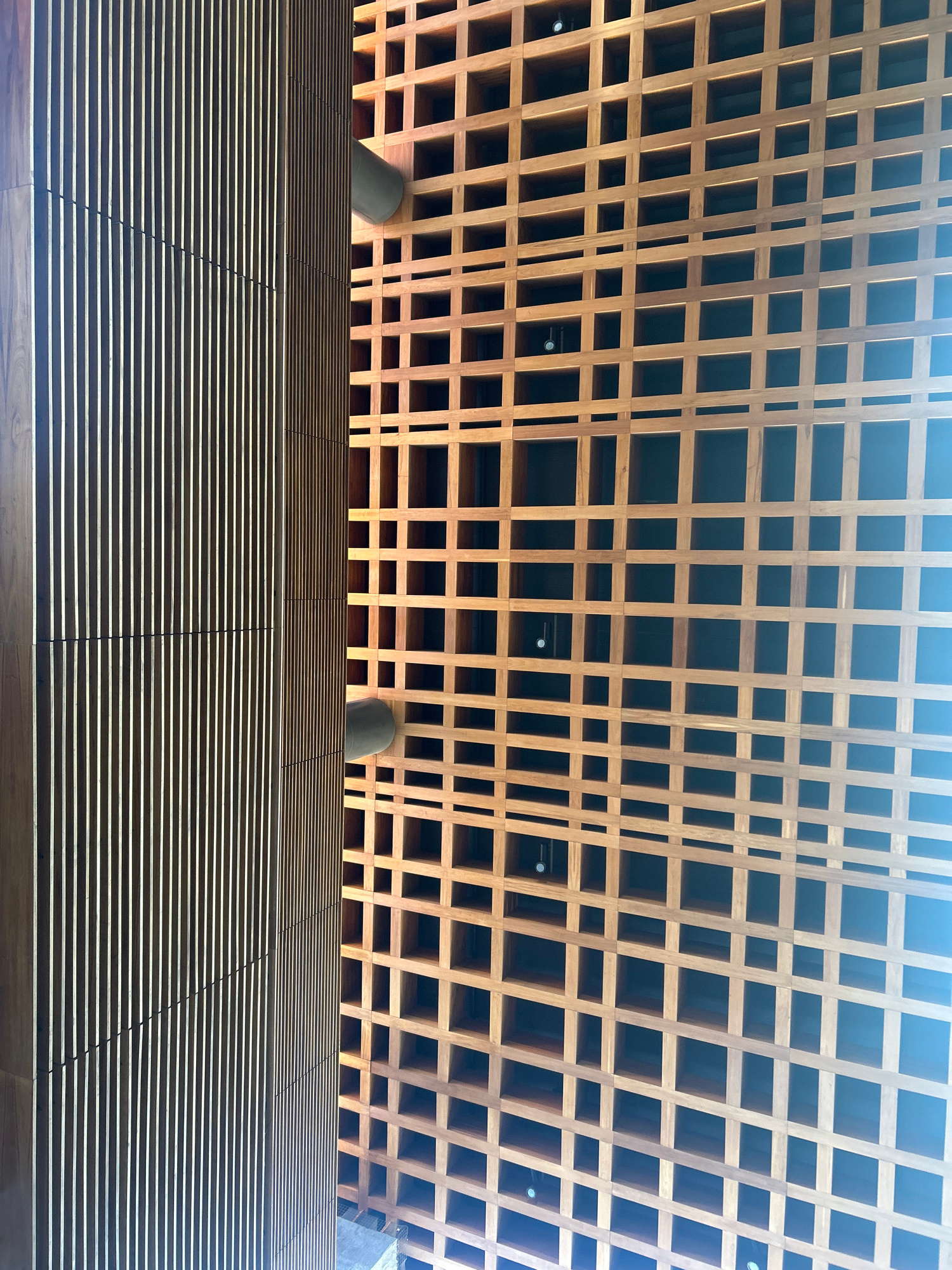 The image shows a low-angle view of a building interior featuring distinctive architectural details. The bottom portion of the frame is filled with a horizontally aligned facade composed of numerous t…read more