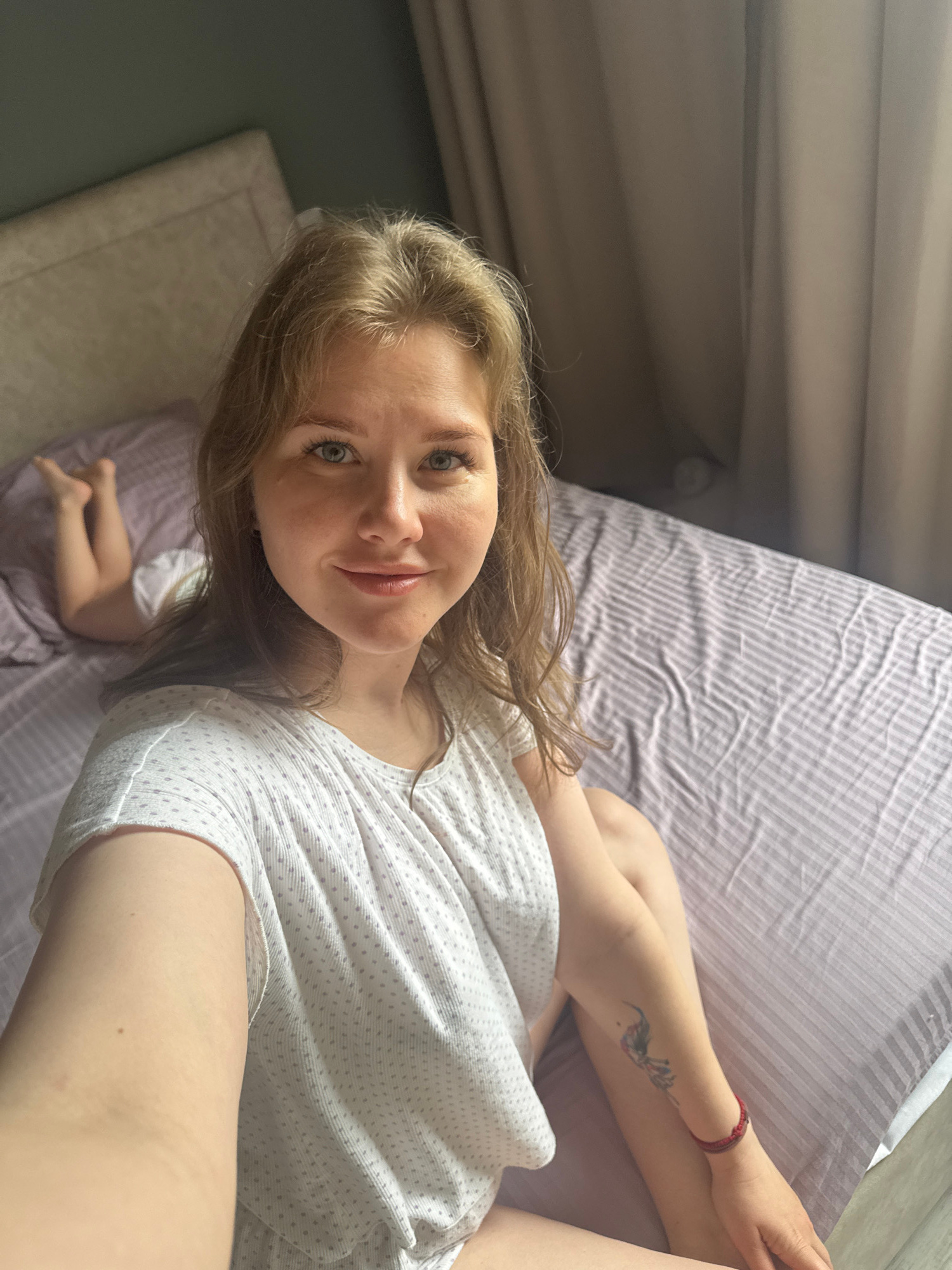 A fair-skinned woman with light brown hair and blue eyes is lying on a bed with purple striped bedding. She is wearing a white t-shirt with a small polka dot pattern. A red bracelet is visible on her…read more