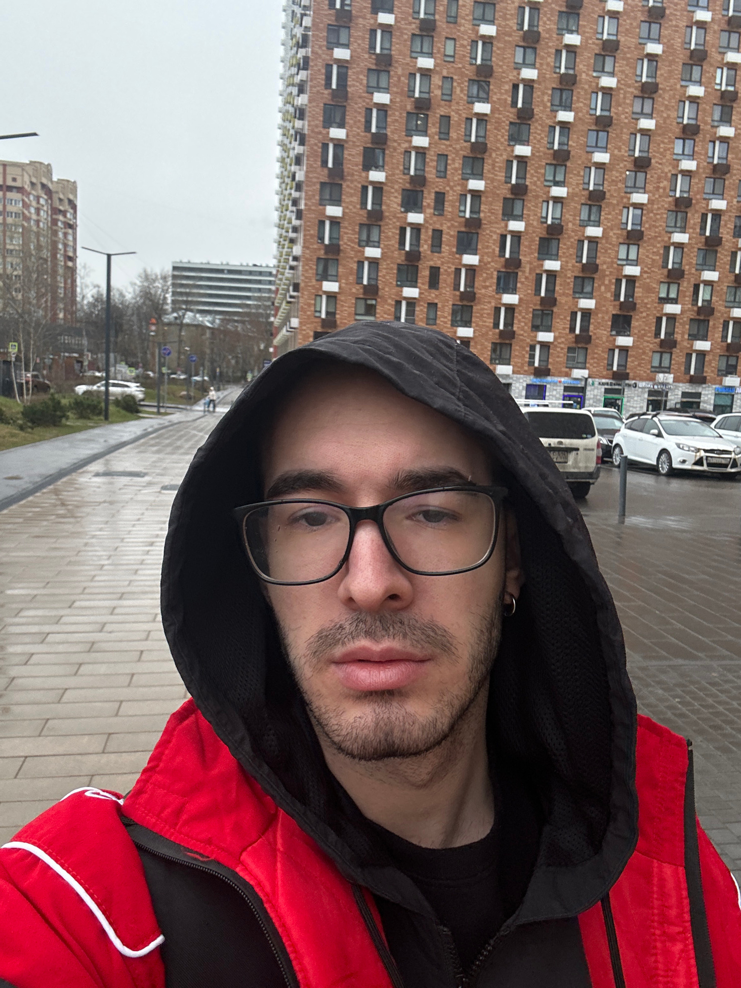 A person in a red jacket and black hooded sweatshirt is standing on a sidewalk in Moscow, Russia. The person is wearing glasses. In the background, there are buildings, including a tall residential bu…read more