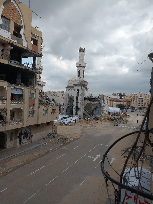 This image depicts a heavily damaged urban landscape in Khan Yunis, Palestinian Territory, under an overcast sky. In the mid-ground, a severely damaged mosque with a partially collapsed minaret and da…read more