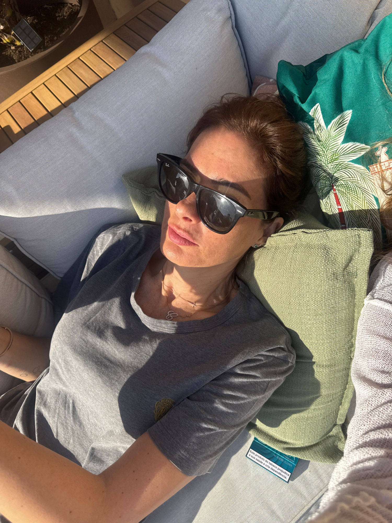 A woman with brown hair and sunglasses lies on a gray cushioned lounge chair with green pillows in an outdoor setting. She wears a gray t-shirt and a delicate necklace. A turquoise IQOS ILUMA package,…read more