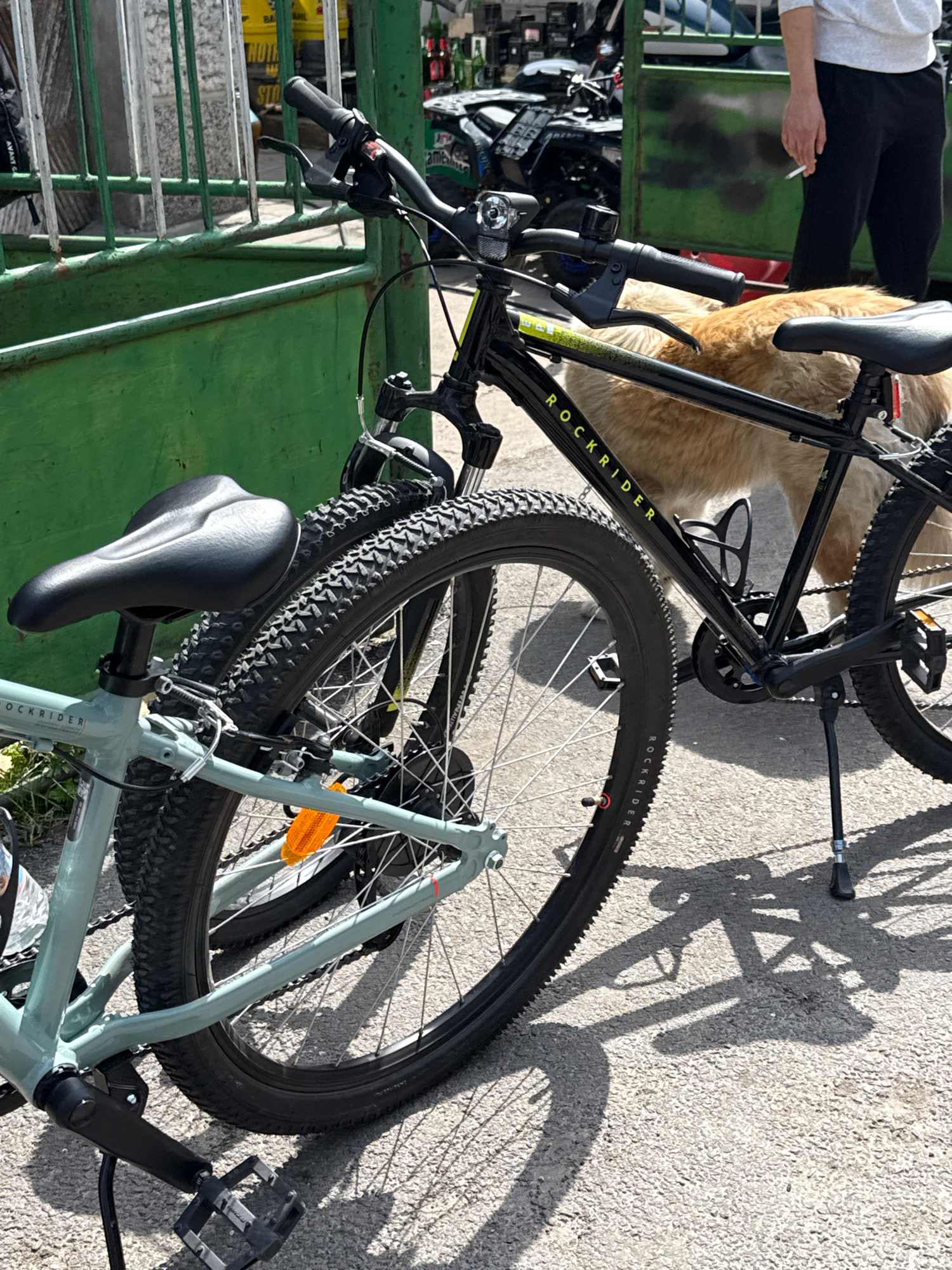 The image shows two bicycles, one black and one light blue, apparently chained together on a green metal structure. The black bicycle is labeled "ROCKRIDER." A partial view of a person in black pants…read more