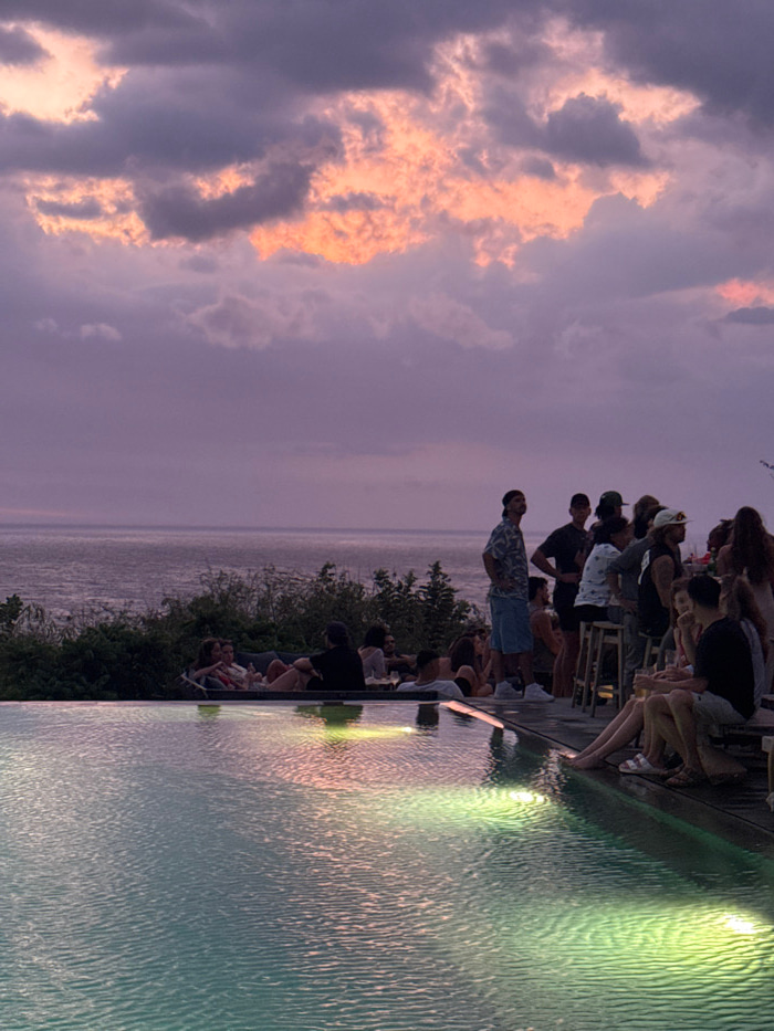 The image depicts an outdoor social gathering at dusk or dawn in Uluwatu, Indonesia. The foreground features an infinity pool with rippled, greenish-blue water reflecting warm, yellowish-green light f…read more