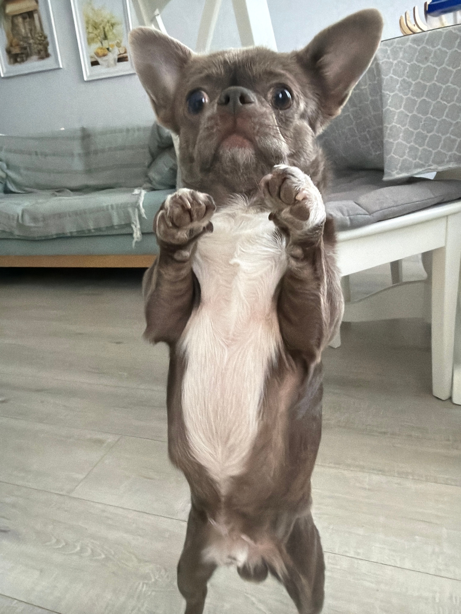 A gray and white dog, possibly a chihuahua mix, is lying on its back on a light-colored wooden floor, with its paws curled up. The dog's fur is gray on the back and white on the belly. Part of a lightβ¦read more