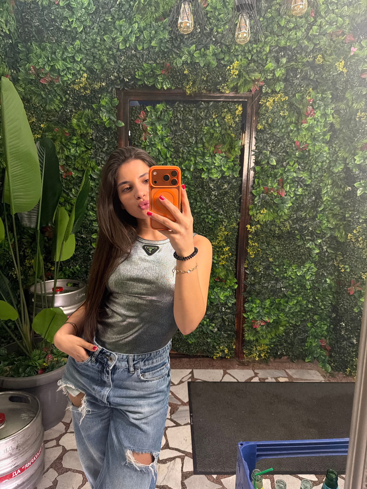 A young woman is taking a selfie in front of a green wall adorned with lights and framed by dark wood. She is wearing a gray ribbed tank top and ripped blue jeans. She is holding an orange smartphone,…read more