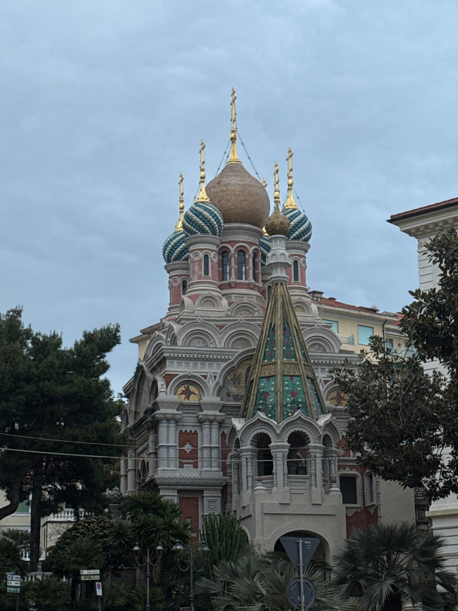 The image shows the Russian Orthodox Church of Christ the Redeemer in Sanremo, Italy. The church features multiple onion-shaped domes, some with gold or copper coloring and others with blue and white…read more