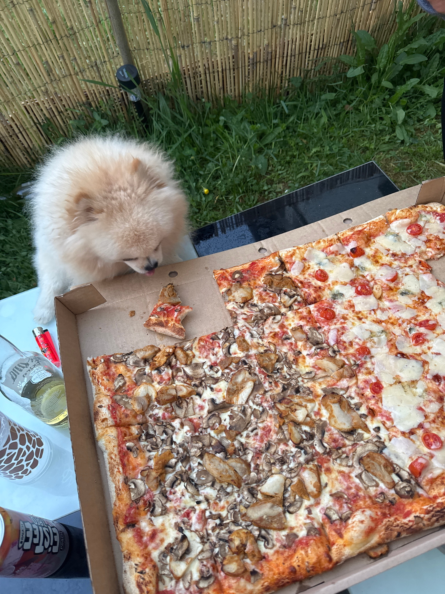 A medium-sized, tan-colored dog is sniffing at a slice of pizza taken out of a large pizza box. The box contains a rectangular pizza with two distinct toppings: one half with sliced tomatoes and white…read more
