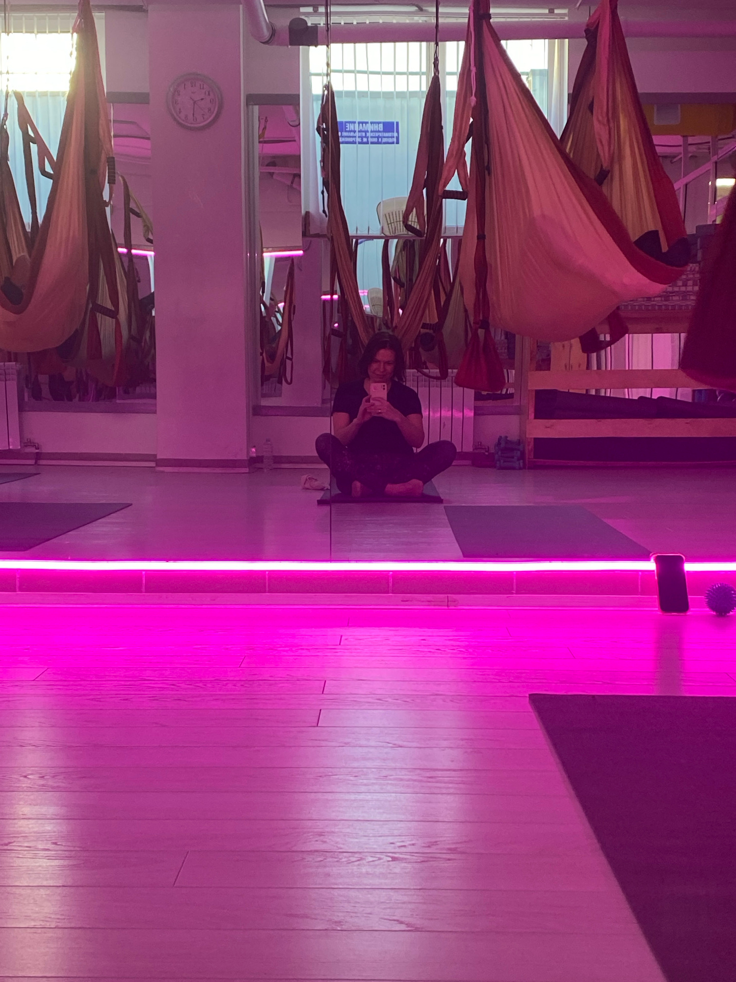 The interior of a fitness studio in Chaikovsky, Russia, features wooden floors illuminated by a strip of magenta lighting. A person is sitting on a mat near the wall. Aerial yoga hammocks hang from thβ¦read more