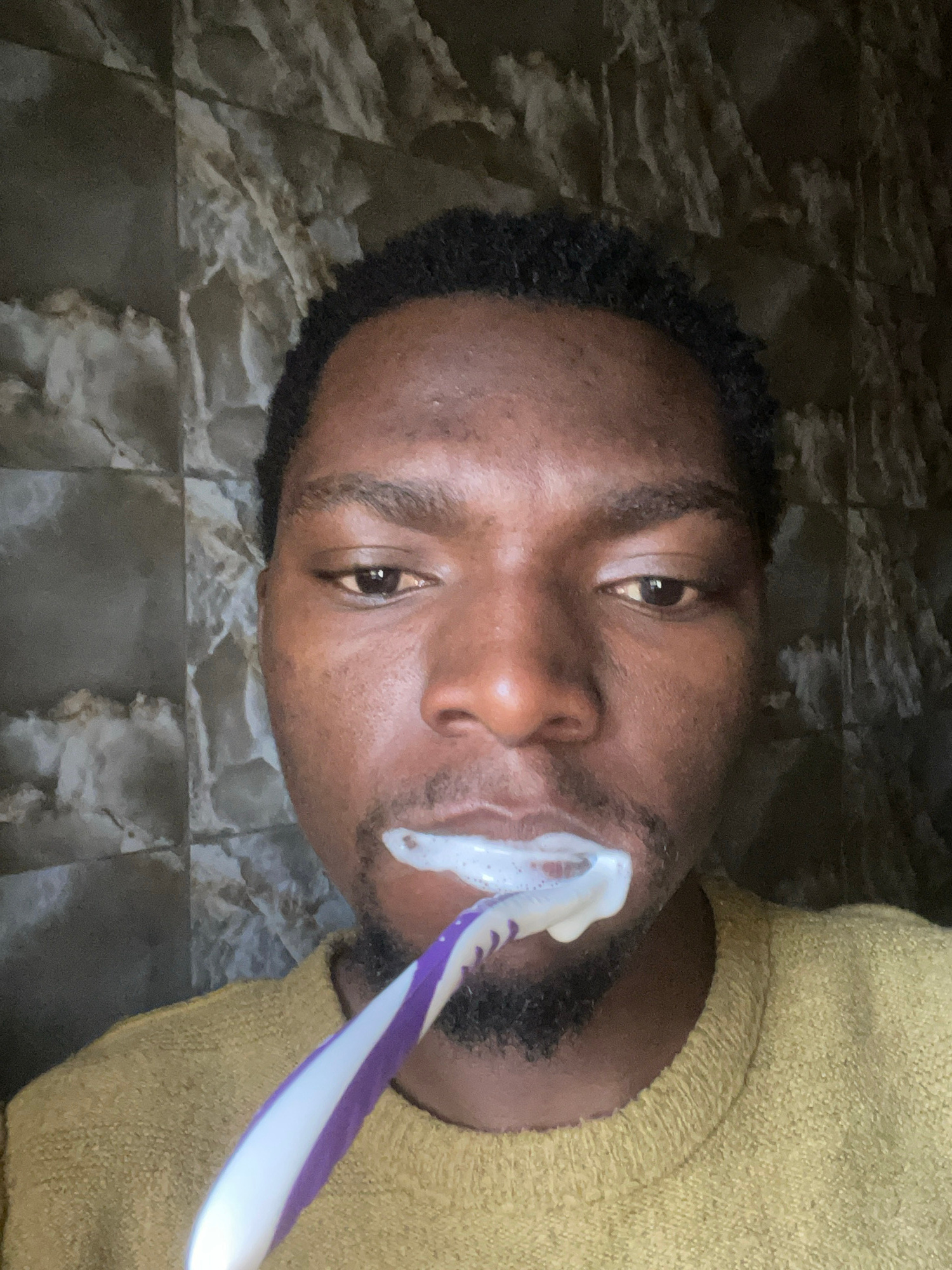 A close-up, rotated portrait shows a young Black man brushing his teeth in an indoor setting in Jos, Nigeria. He is positioned horizontally in the frame, with his head tilted slightly. He has dark, sh…read more