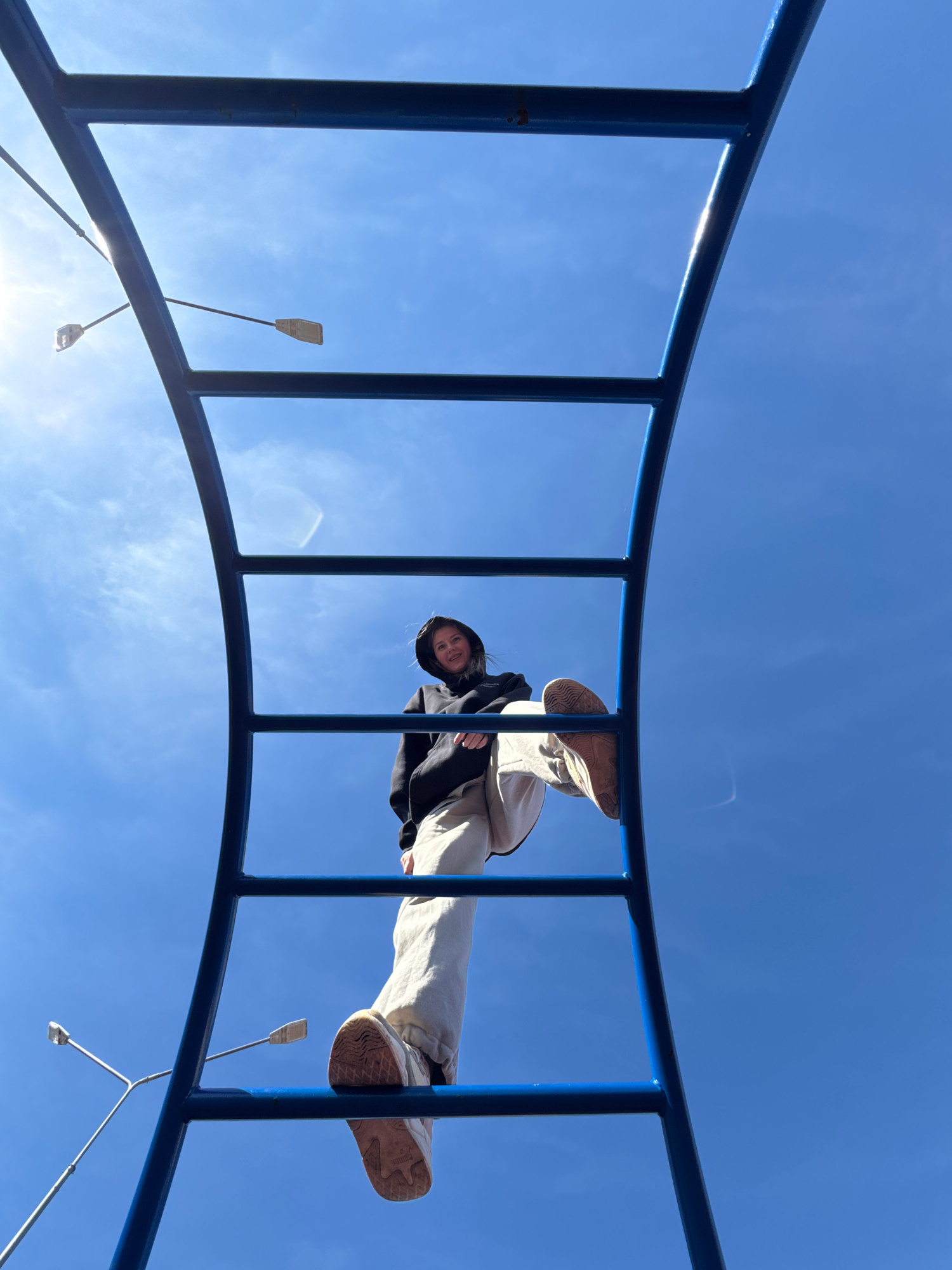 A low-angle shot looking up shows a person on a blue metal climbing structure against a bright blue sky. The person is wearing light-colored pants and sneakers, with a dark jacket or hoodie. Two light…read more