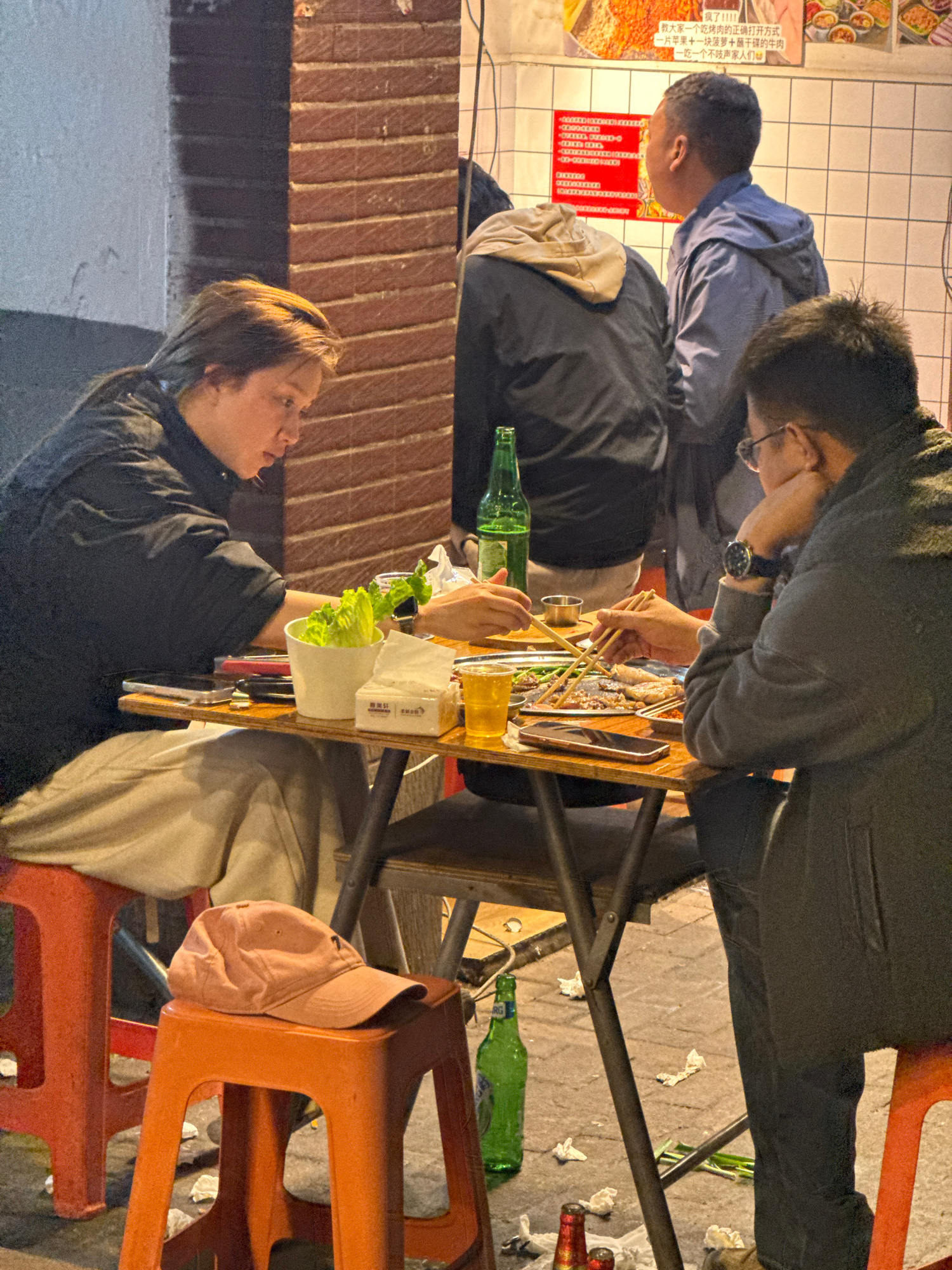 Here is a concise description of the image: The image captures an outdoor dining scene, likely in the Yuzhong District of China, given the presence of Chinese script on a nearby menu. Several people…read more