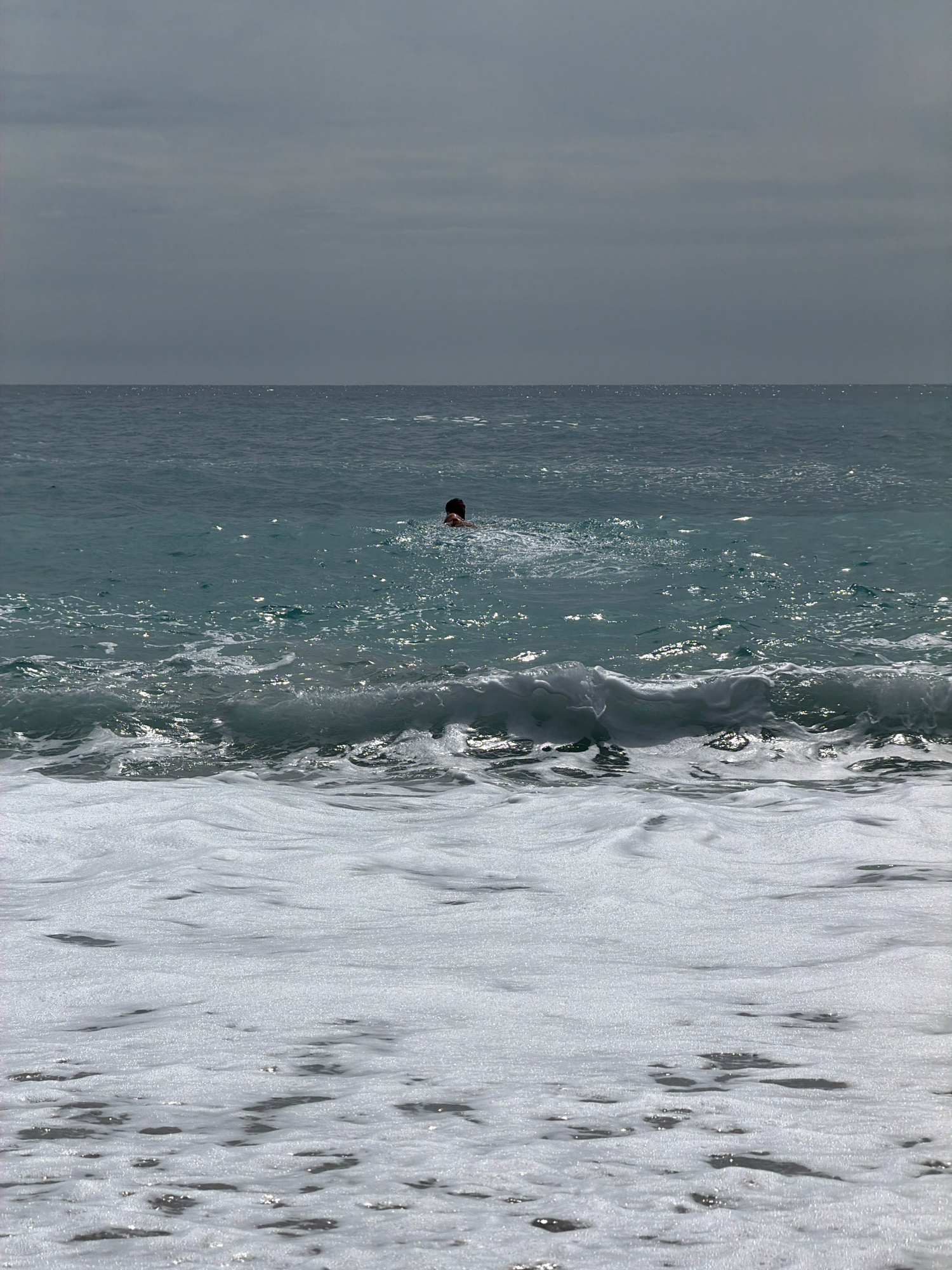 A horizontal shot shows a beach scene in Drobnići, Montenegro. A body of water stretches across most of the frame, transitioning from a hazy gray at the left edge towards turbulent waves and foam in the right section. These waves are bright white and appear to be crashing, with small dark pebbles or other material caught in the foam. In the center-left of the image, there is a small, dark head visible in the water, indicating someone swimming or floating. The sky above the water is a uniform gray. | Open Wire