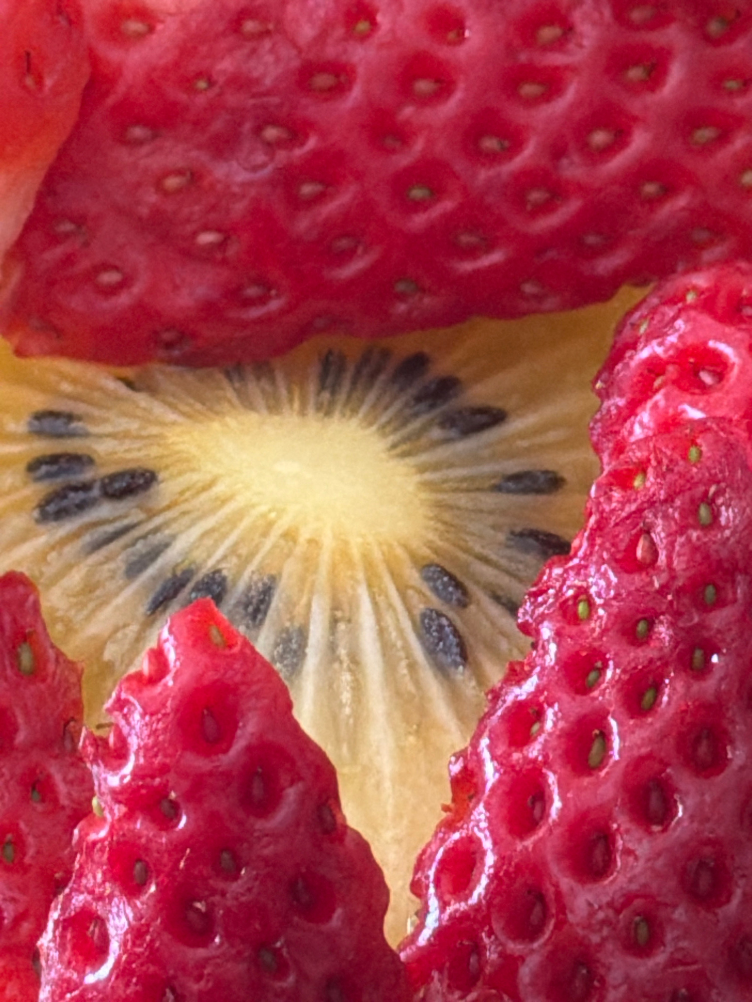 The image is a close-up shot of food, specifically strawberries and kiwi. The strawberries, with their red color and visible seeds, are positioned on either side of a slice of kiwi. The kiwi has a yel…read more