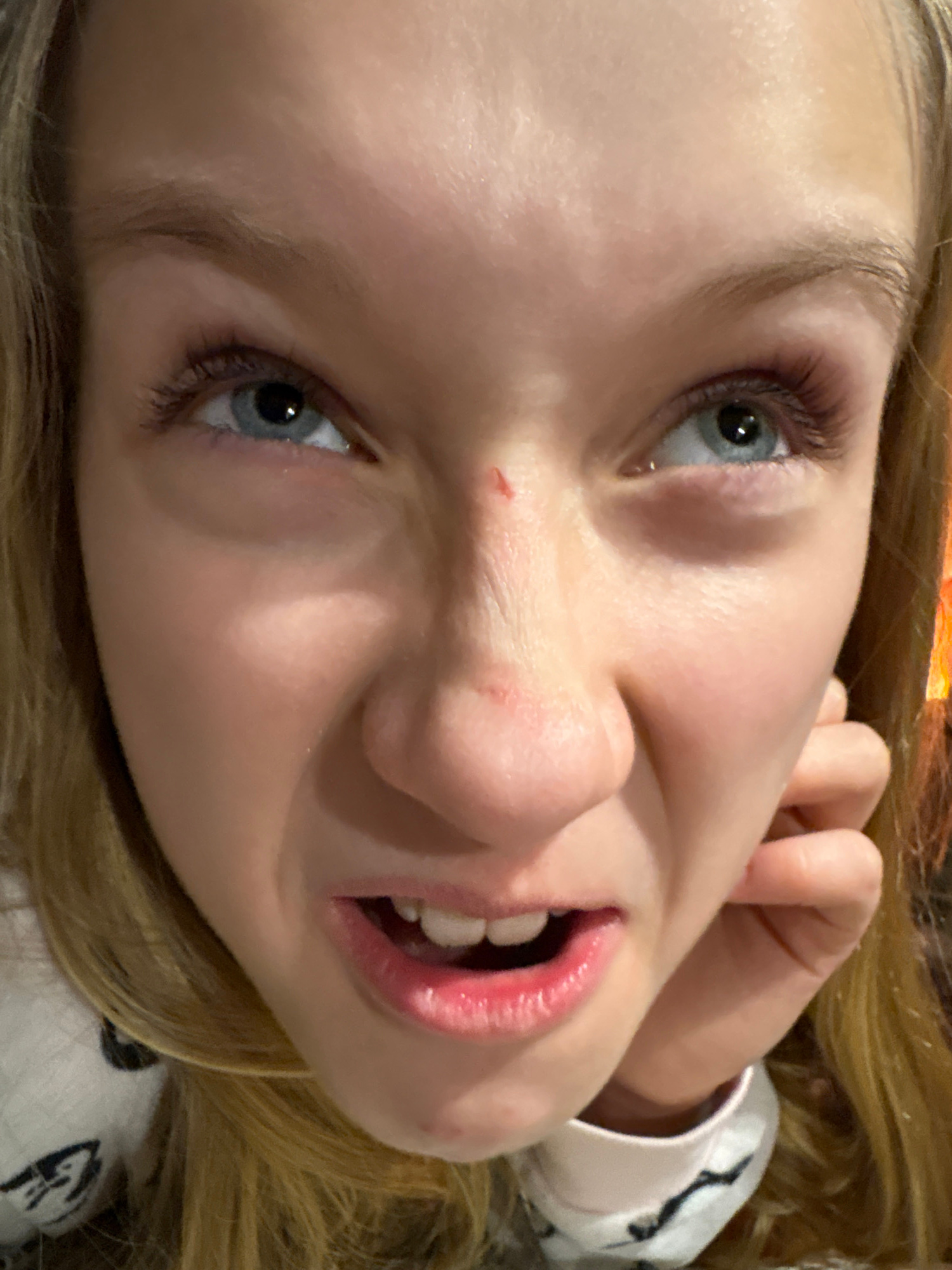 A close-up, tilted shot of a young, fair-skinned person with light blonde hair and blue eyes. The person's head is tilted to the right. A hand is near their face, and their mouth is slightly open, rev…read more