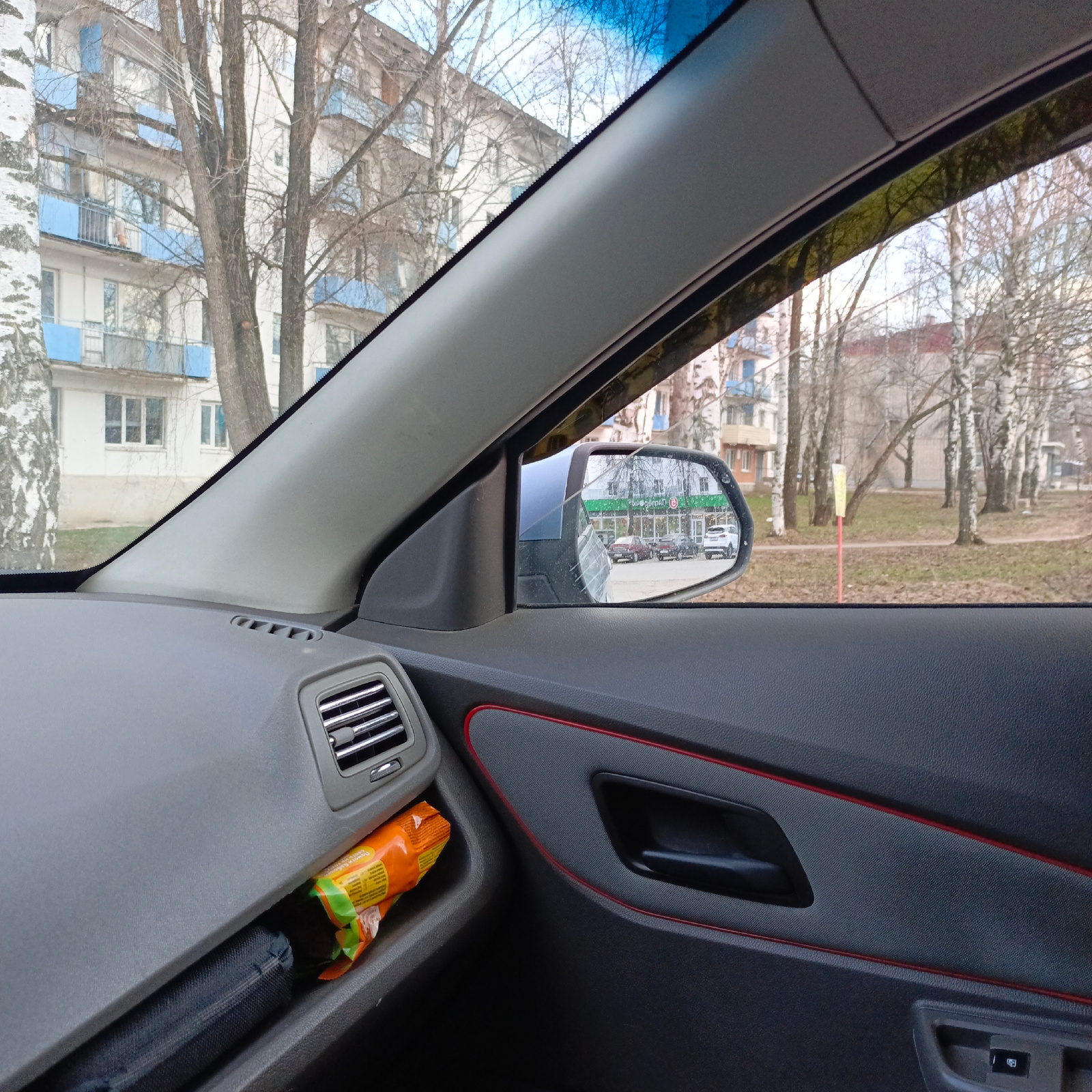 From the interior of a vehicle, the scene is of an urban area in Unknown, Unknown, observed through the window and side mirror. Outside the vehicle, there's a residential building with blue balcony ra…read more