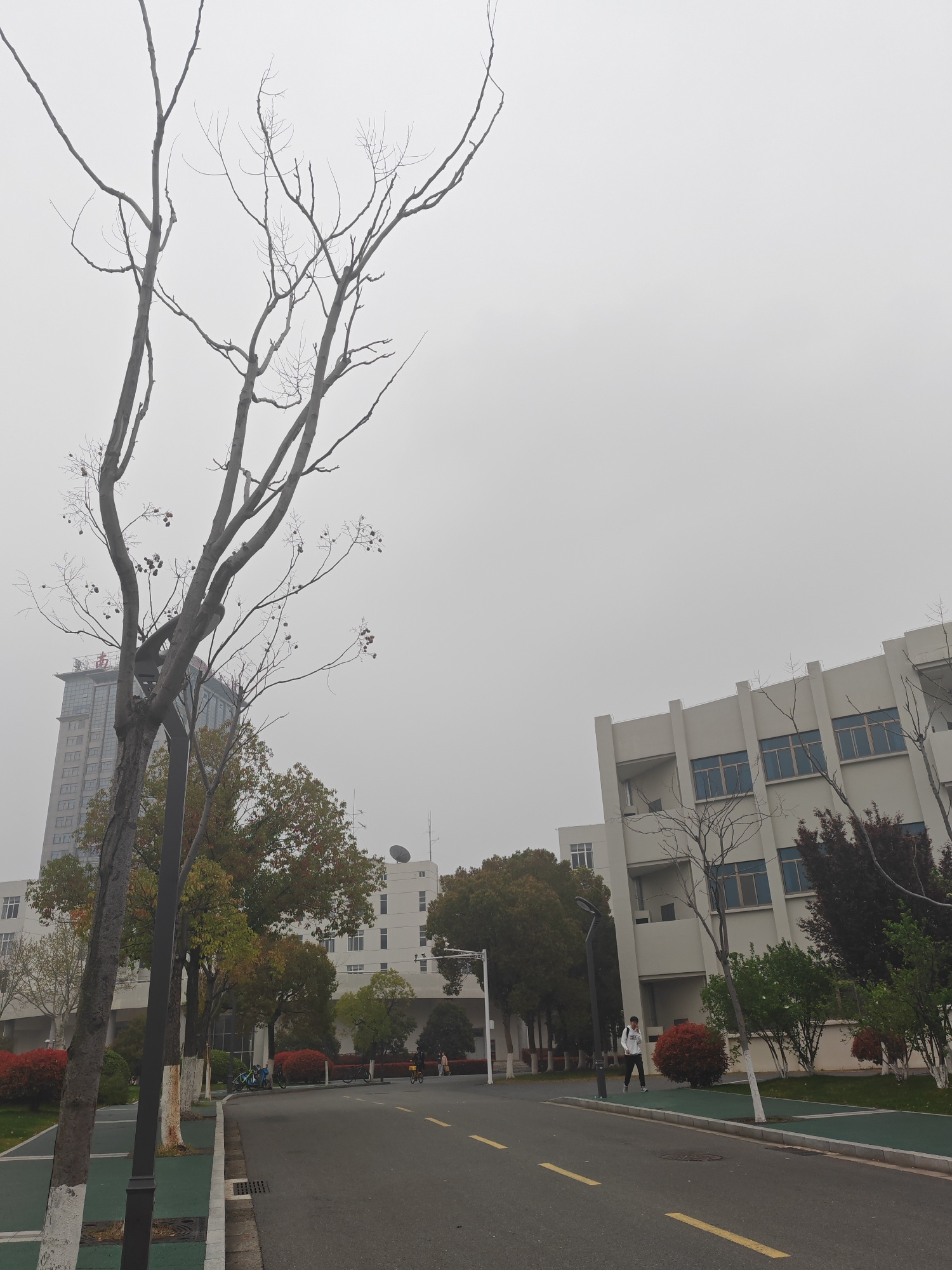 The photo depicts a street scene in Jiangning District, China, on a cloudy day. A two-lane asphalt road with yellow lane markings runs through the frame. A green pedestrian path borders the road on th…read more