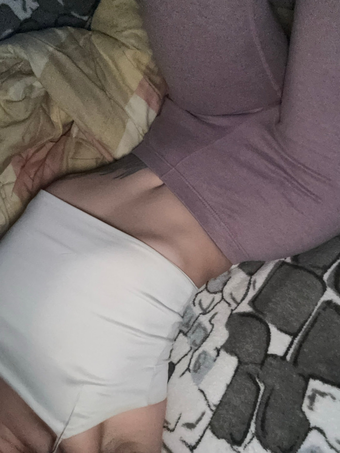 A person is lying on a bed covered with a patterned pillow and a yellow and brown quilt. The person is wearing mauve athletic leggings and a white tank top. The legs are bent, and the torso is visible…read more