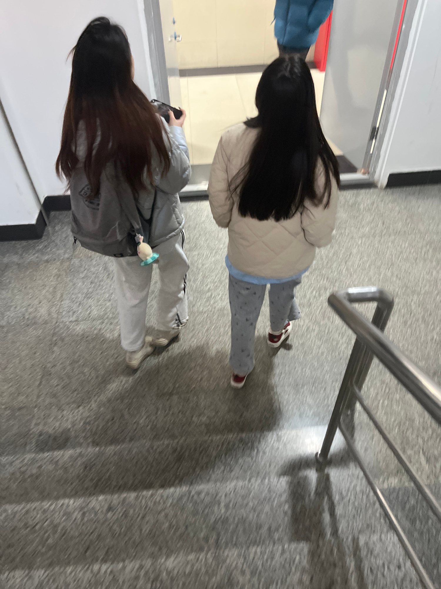 The image shows an overhead shot of two people standing on a gray speckled floor. The person on the right has long black hair, a beige puffer jacket, and patterned gray pants with red shoes. The perso…read more
