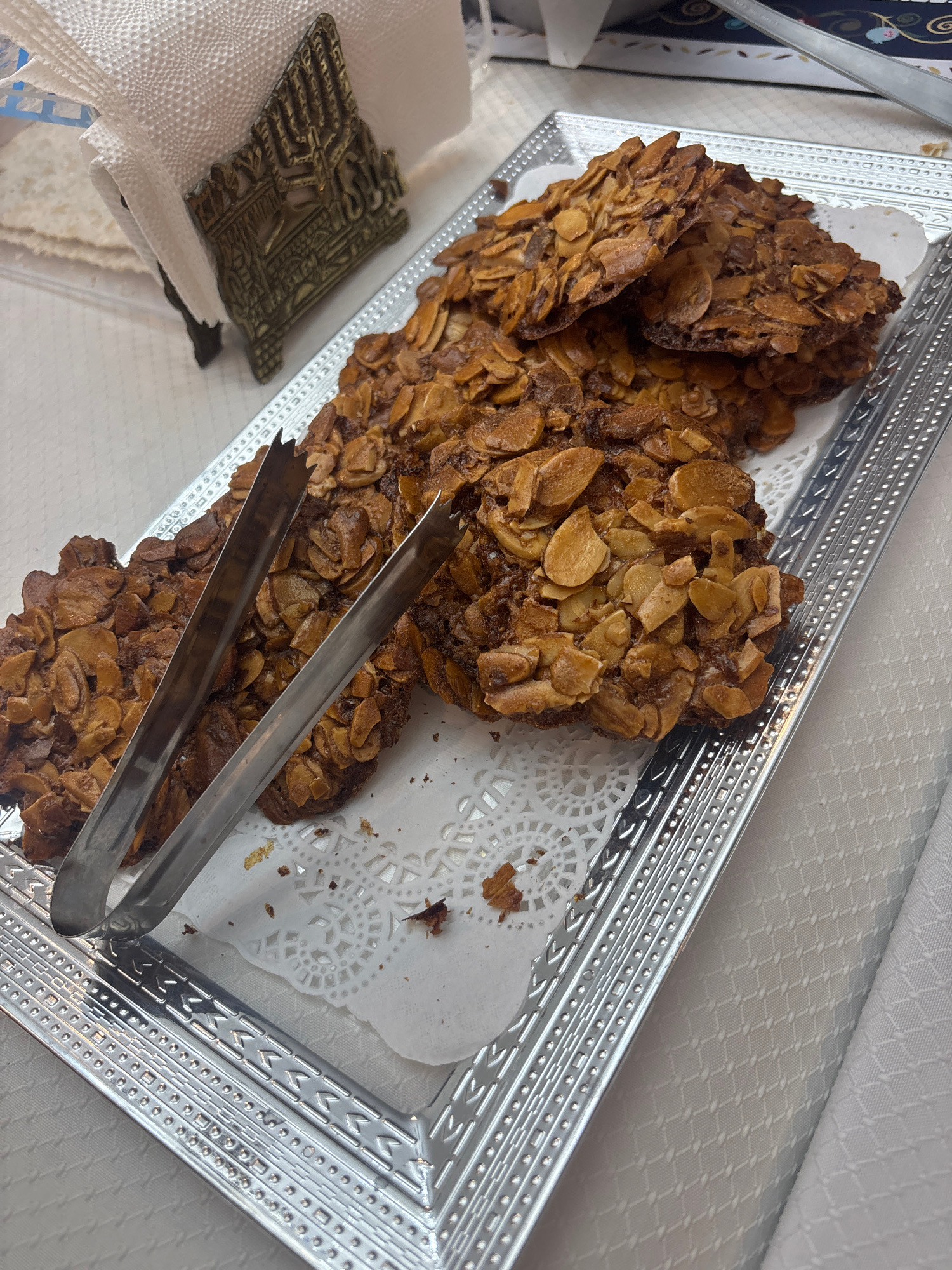 A high-angle shot displays a silver rectangular tray holding several almond brittle cookies on white doilies. A pair of silver tongs rests across the cookies. The tray sits on a white tablecloth. To t…read more