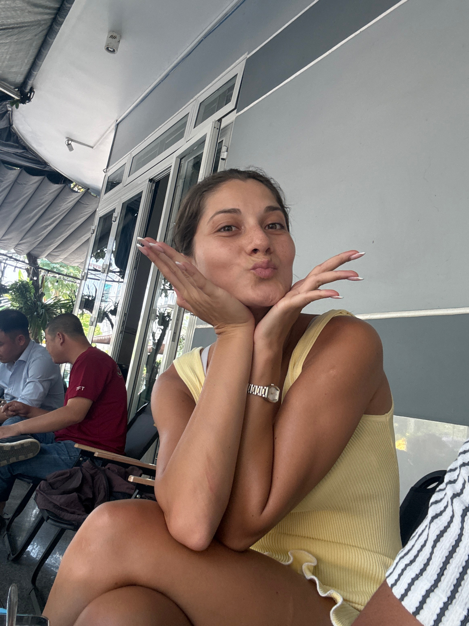 A woman in a yellow top with a silver watch is posing for a photo. Two men are in the background. The location may be a restaurant in Đà Nẵng, Vietnam based on the plants visible through the windows a…read more