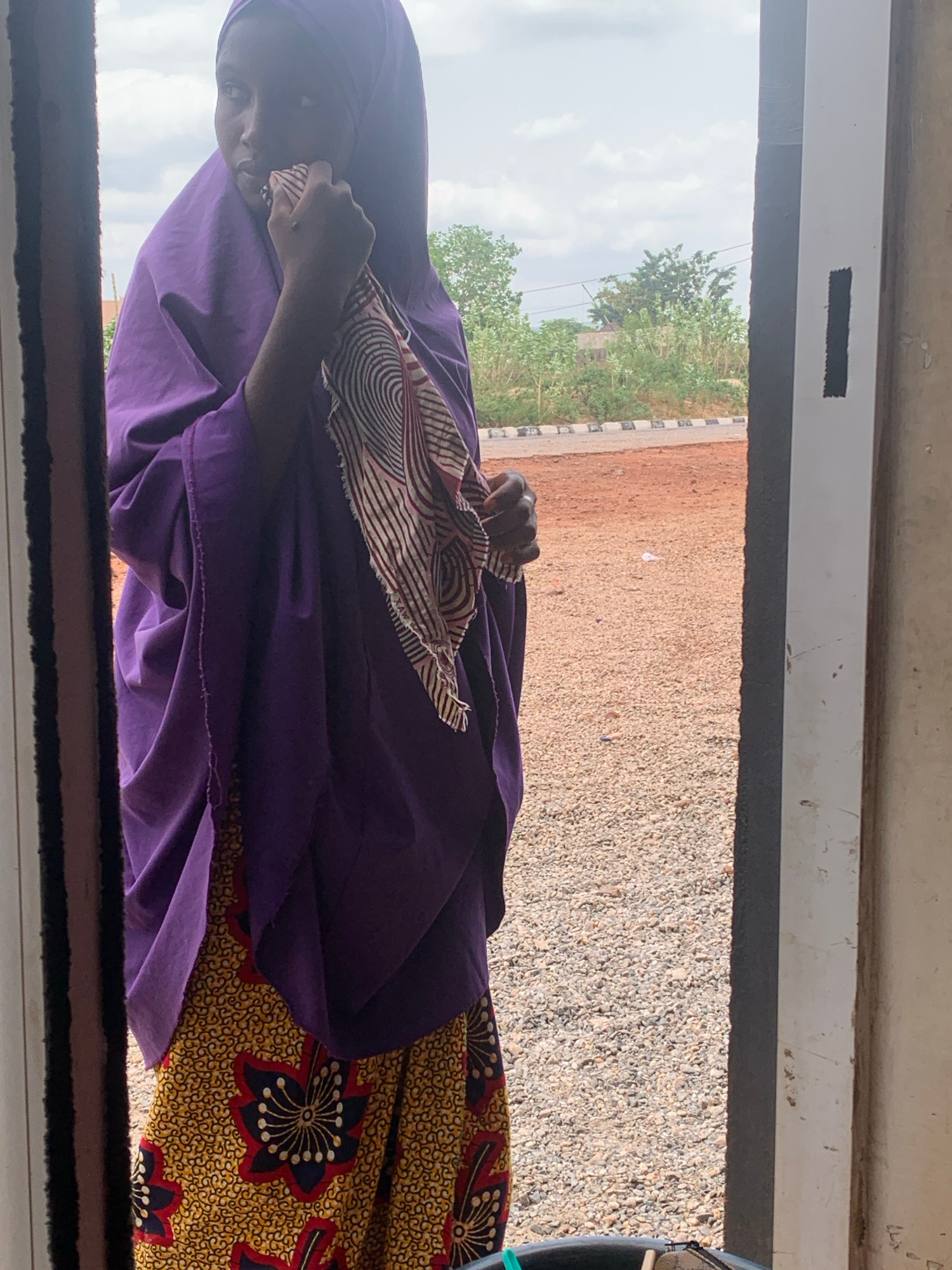 A medium shot depicts a woman with dark skin, clad in a purple robe and head covering, standing outdoors, viewed from a partially obscured vantage point behind a white frame. She's holding a brown and…read more