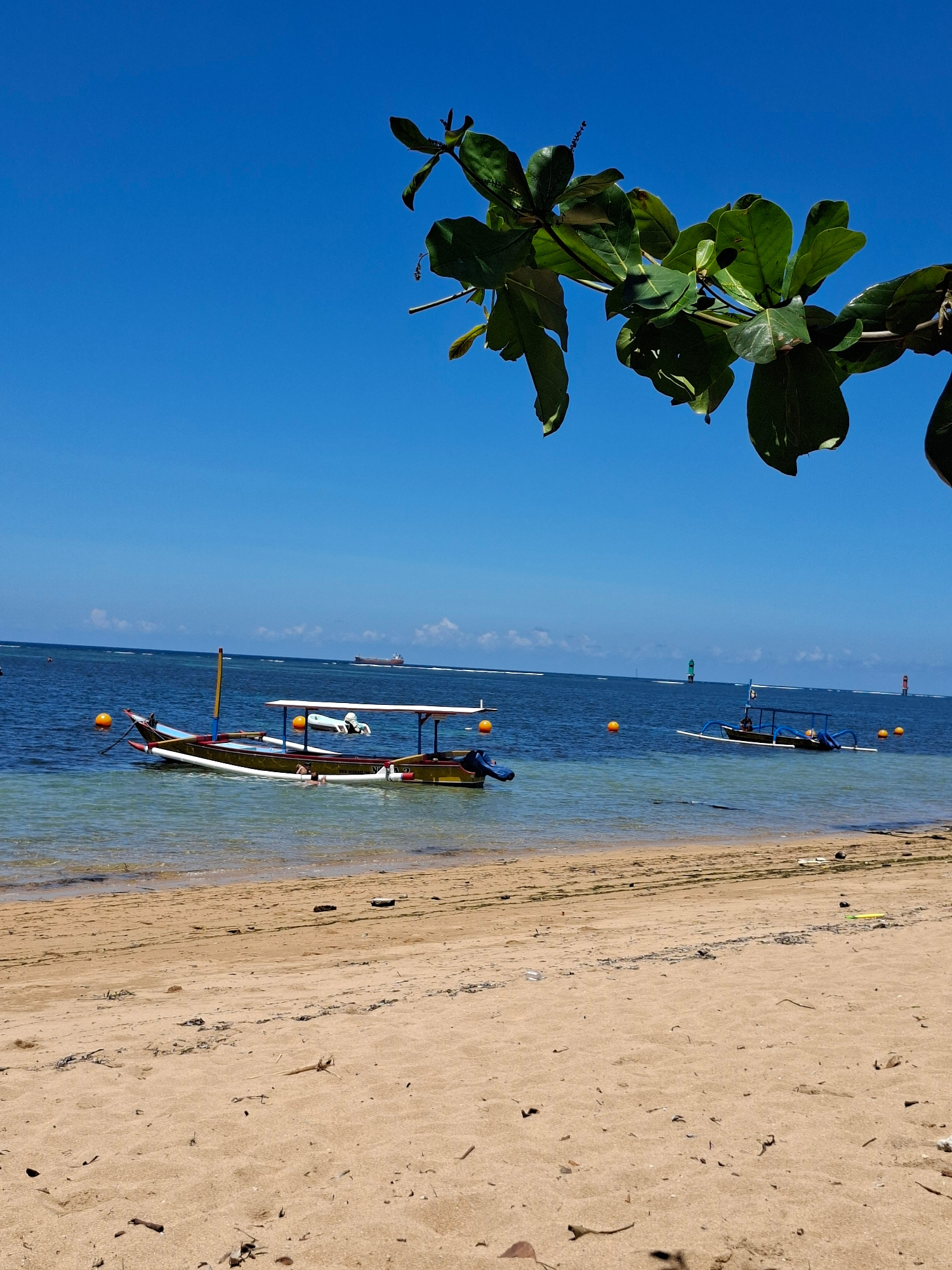 The image depicts a beach scene in Denpasar, Indonesia. In the foreground, a tree branch with green leaves is visible against a clear blue sky. The beach features light-colored sand with scattered deb…read more