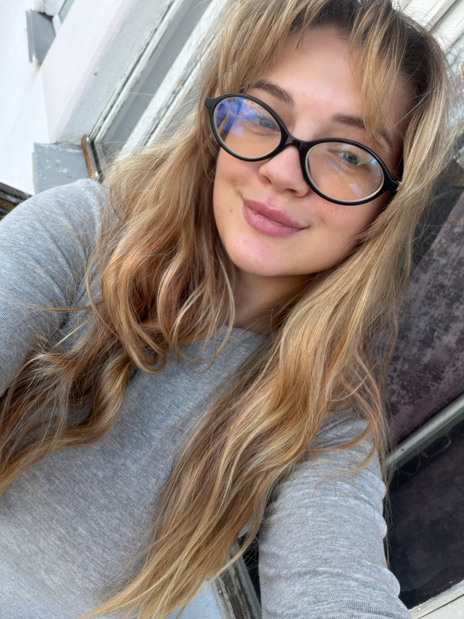 A female subject is depicted in a close-up, upward-angled portrait shot, presumably in Naberezhnye Chelny, Russia. She has long, wavy blonde hair with lighter and reddish-blonde highlights, framing heβ¦read more