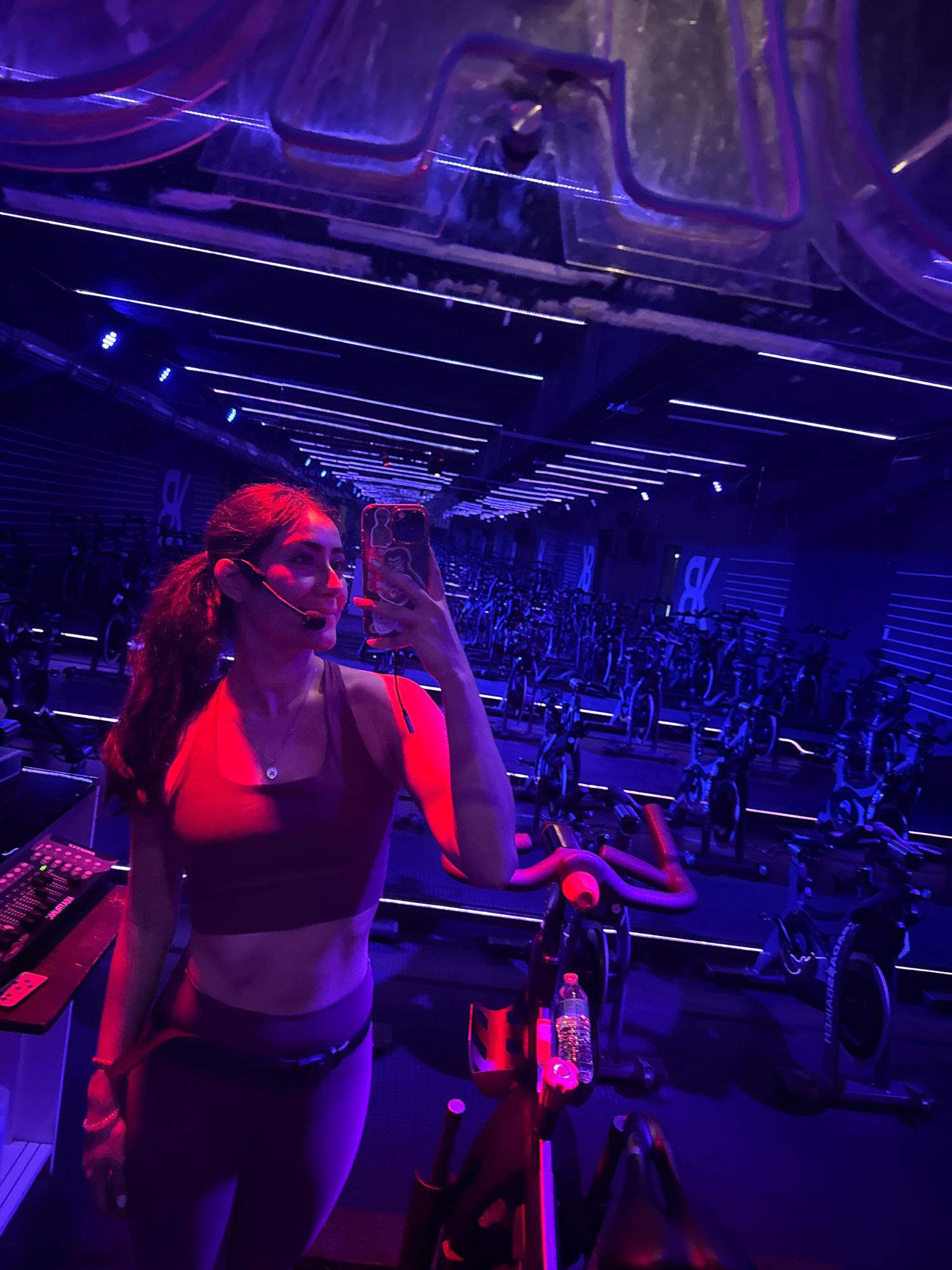 A woman takes a selfie while seated on a stationary bike in a dark exercise studio. The studio features rows of stationary bikes arranged in lines under blue neon lights. The woman, clad in burgundy w…read more