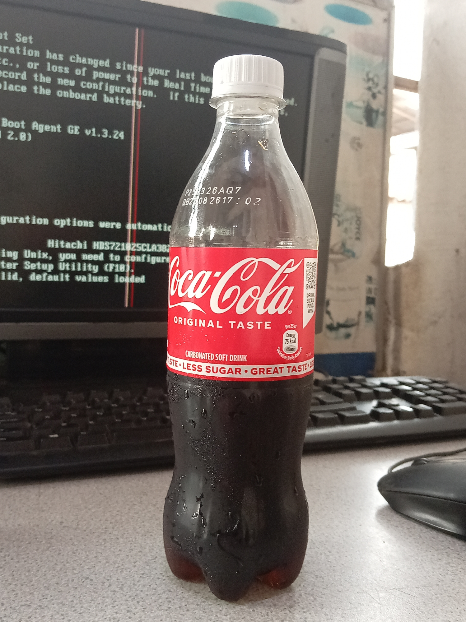 The image shows a bottle of Coca-Cola on a desk. Behind the bottle, there is a computer monitor displaying boot-up text. A keyboard and a computer mouse are also visible on the desk. The Coca-Cola bot…read more