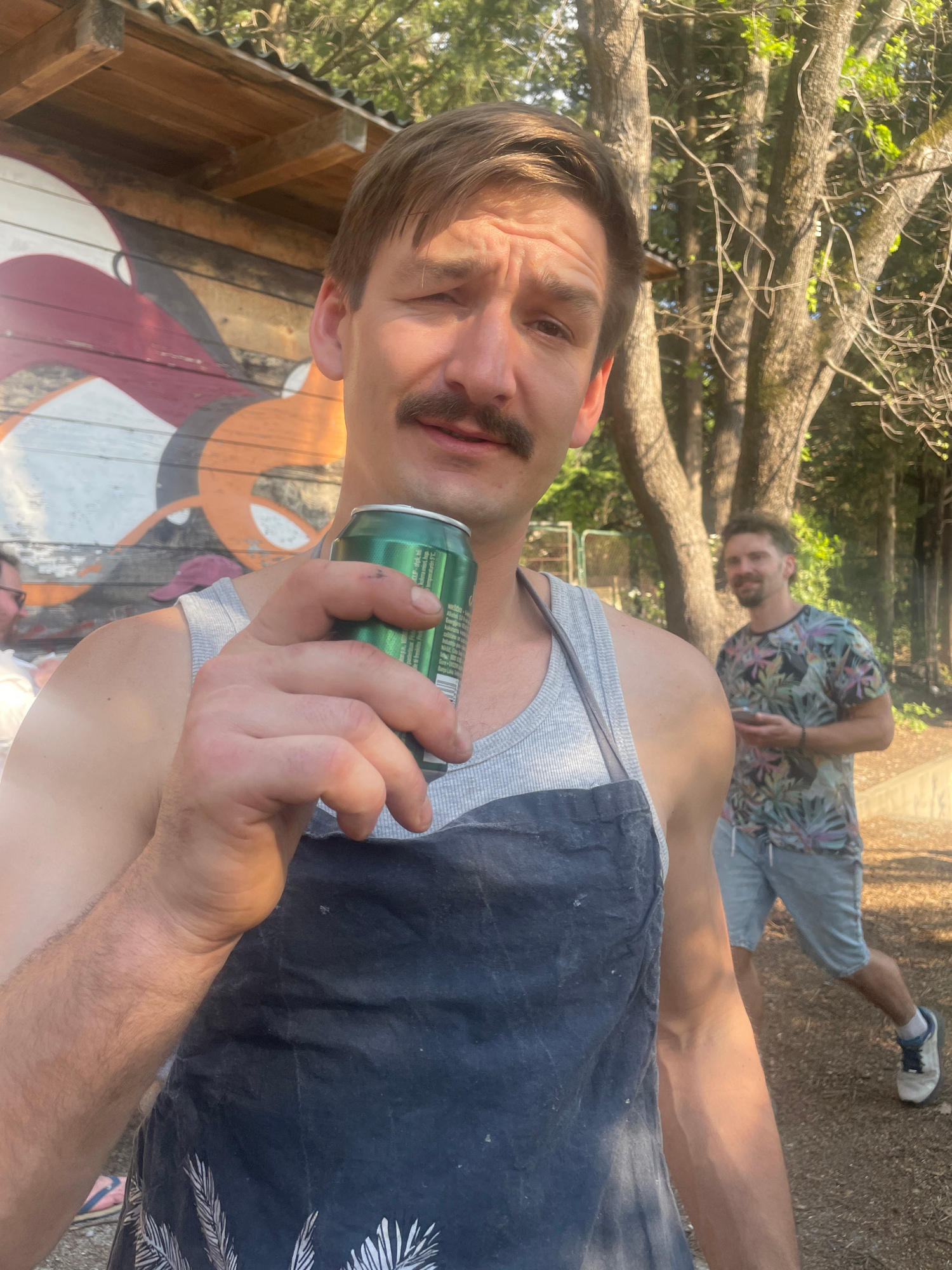 This outdoor image, taken in Kamenovo, Montenegro, captures two men in a casual, sunny setting, likely during the late afternoon. In the foreground, a man with a mustache and short brown hair looks dā¦read more