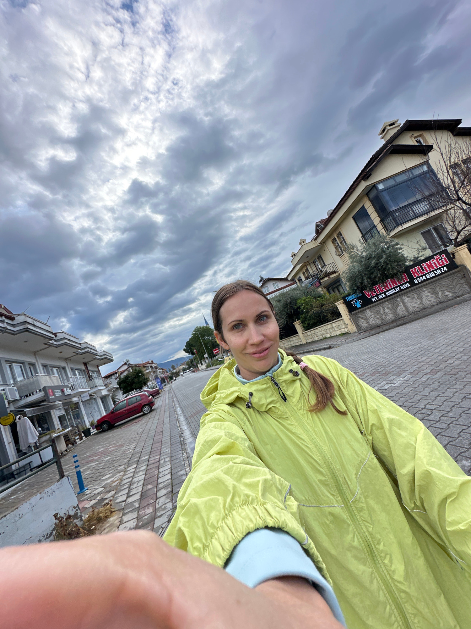 A woman in a light green jacket is taking a selfie on a street in Fethiye, Turkey. The sky is cloudy. A red car is parked along the street. Buildings line the street, one of which has a sign in Turkis…read more
